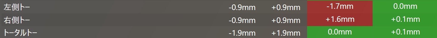 数値のズレとしては左右でトーイン、トーアウトがちぐはぐになっていました。