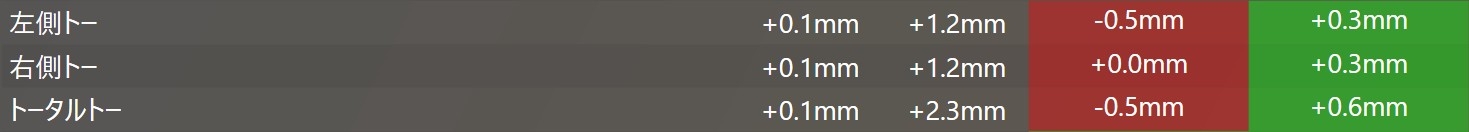 数値のズレとしてはフロント左側のトーがアウト側にズレていました。