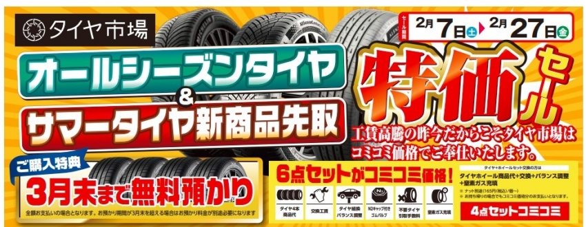 【2/7~2/27】サマータイヤ、オールシーズンタイヤセール中!【3月まで預かり無料特典】