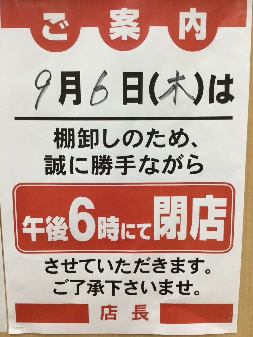 9月6日(木)は当店棚卸のため 誠に勝手ながら午後6時にて閉店させていただきます。