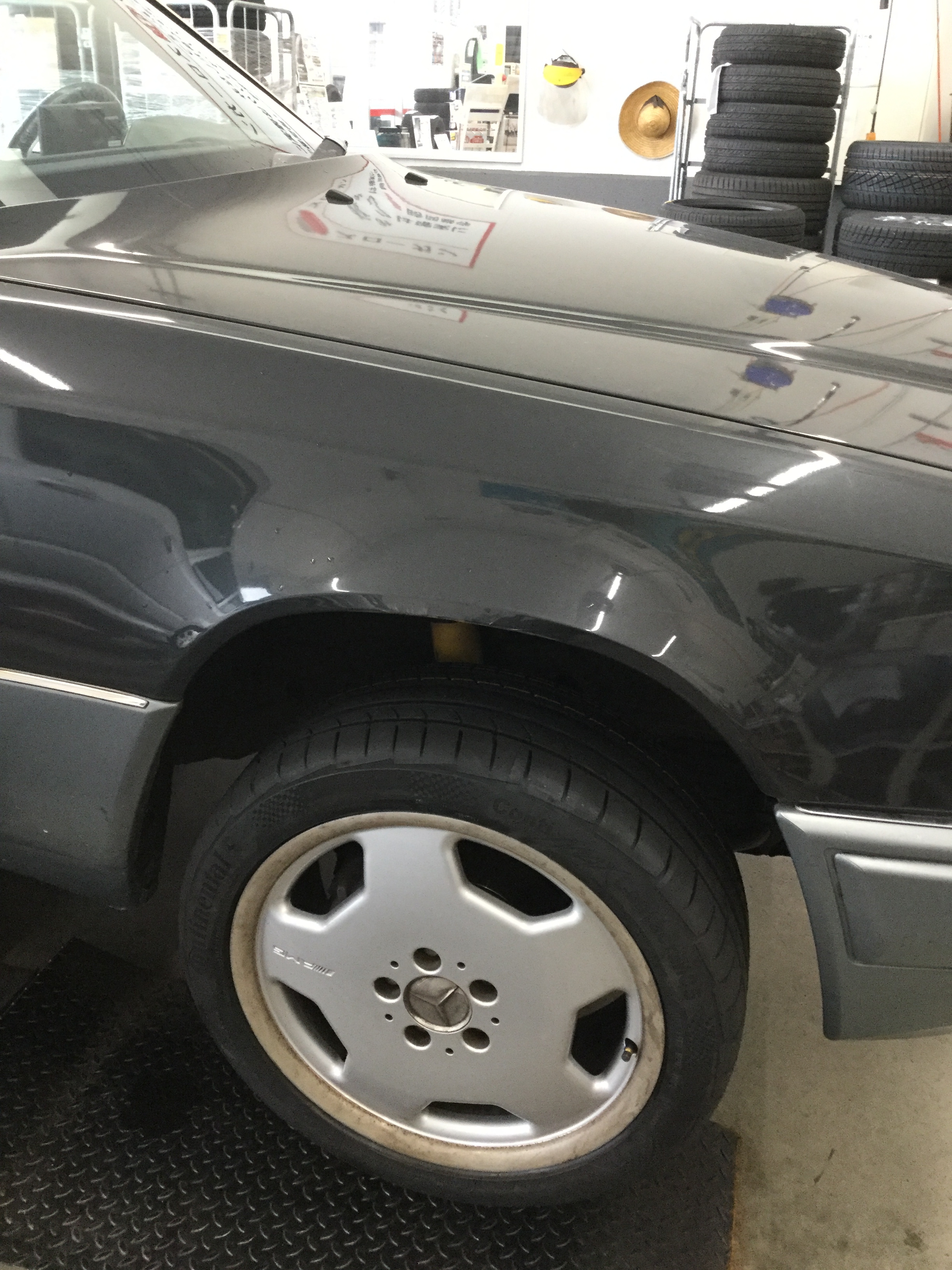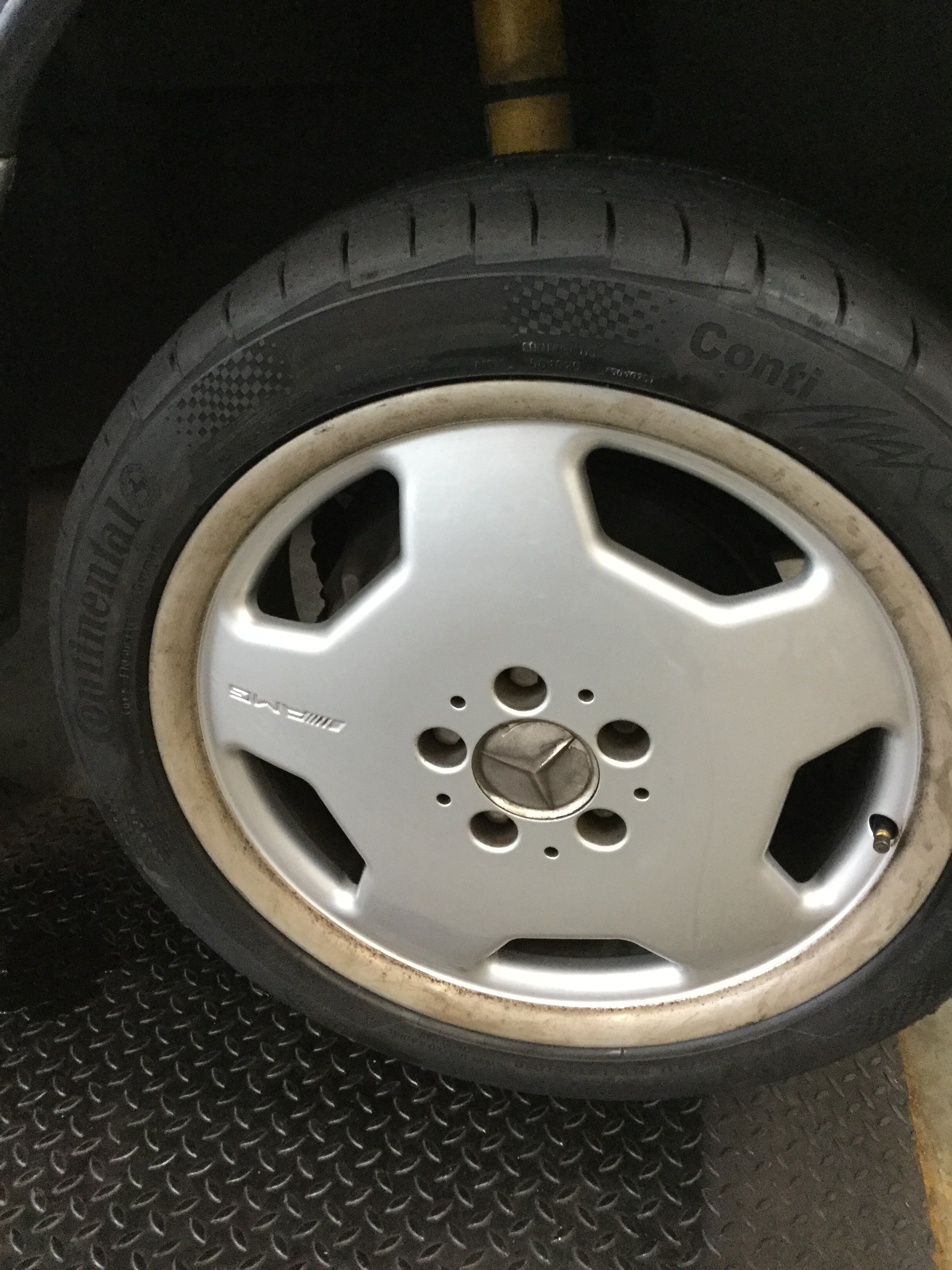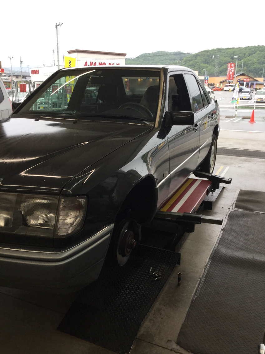 懐かしいタイプのメルセデスベンツ 320E のタイヤ交換作業を