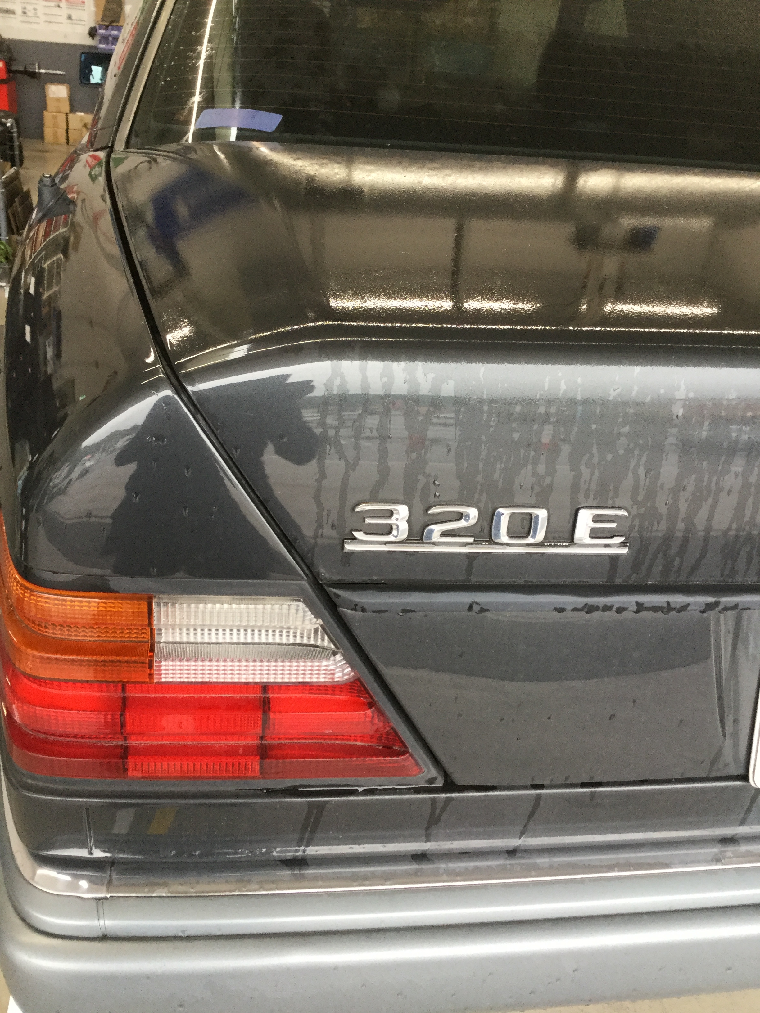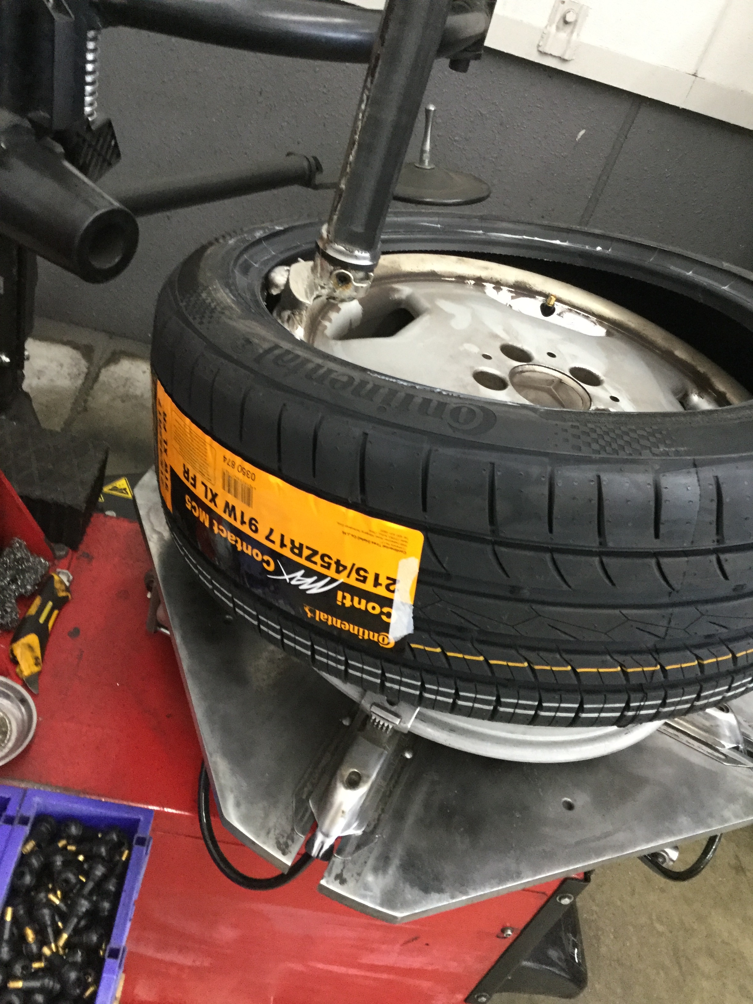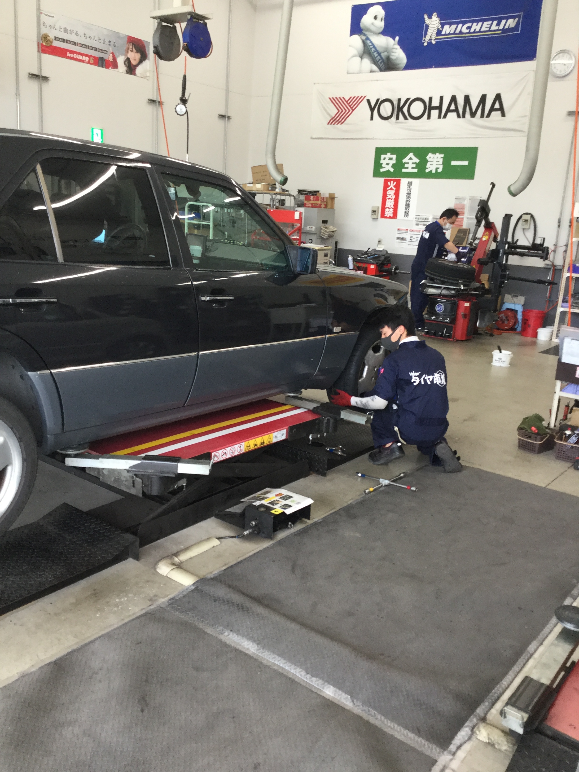 懐かしいタイプのメルセデスベンツ 320E のタイヤ交換作業を