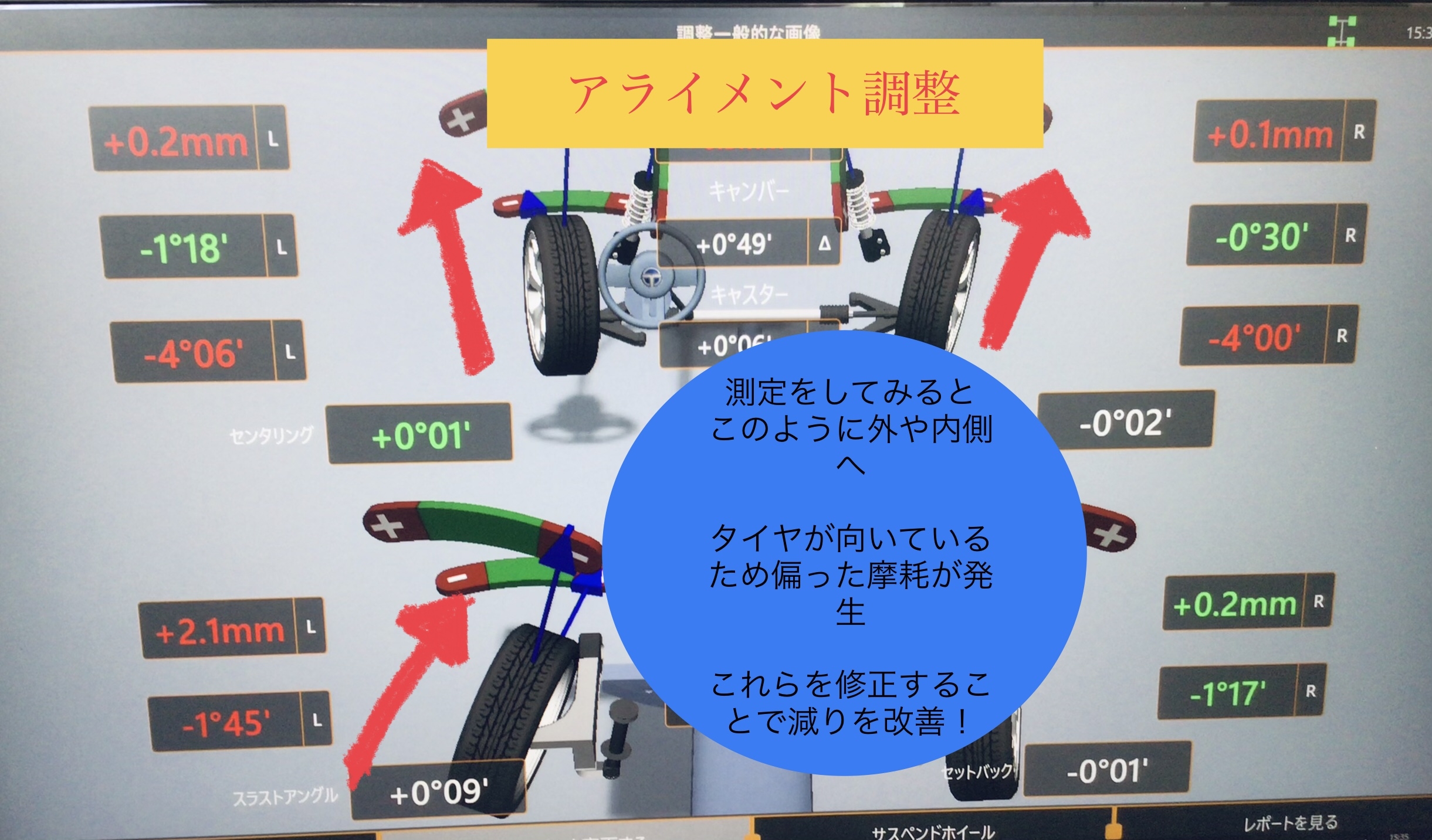 タイヤ市場ではデータ化をし、現在のタイヤの取り付け角度を確認・調整ができます