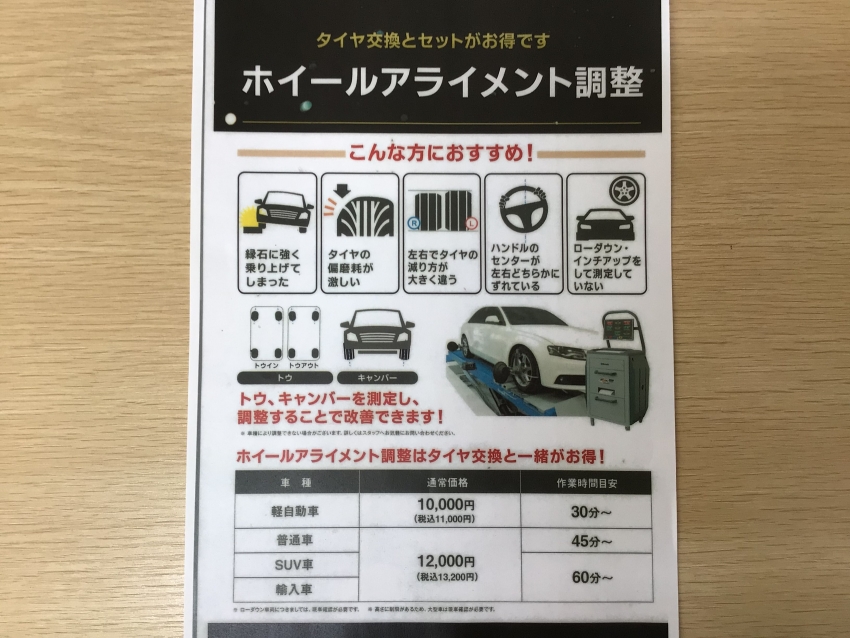 当店でのタイヤ交換時のおススメサービス『アライメント』をご案内いたします