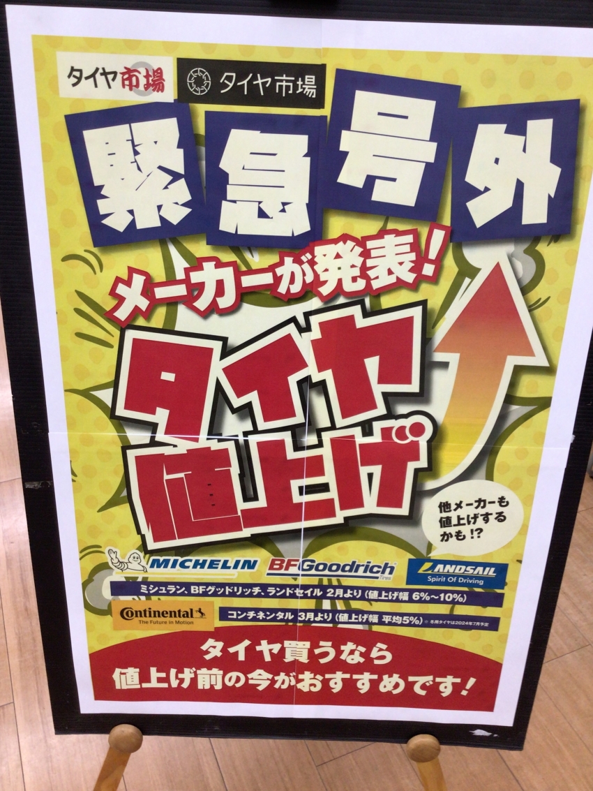 各メーカー、タイヤの値上げが予定されておりご購入を予定されているお客様はお早目にご購入をおススメいたします