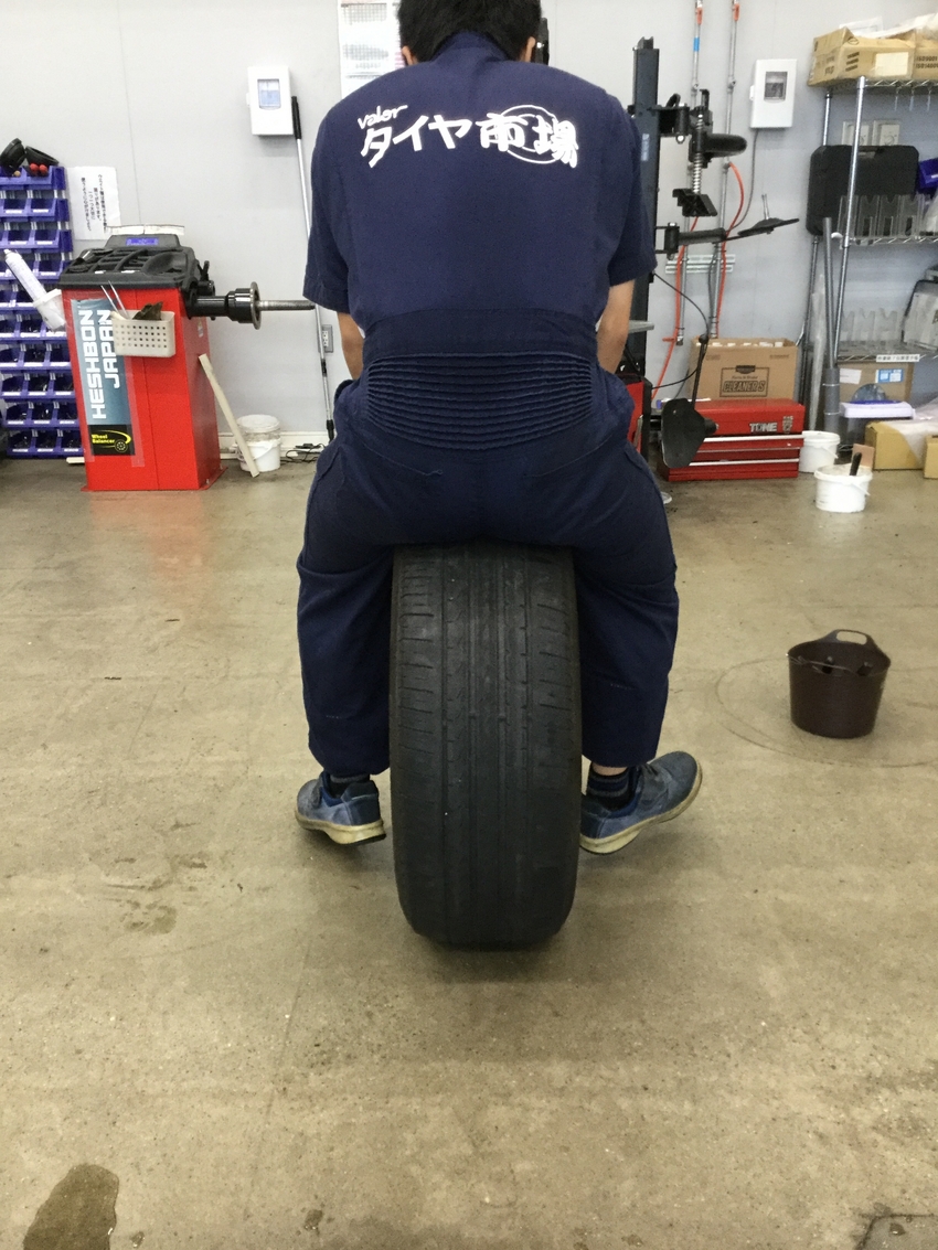 古いタイヤをホイールからはがすのはパワーとテクニックと強い精神力がいるのです。