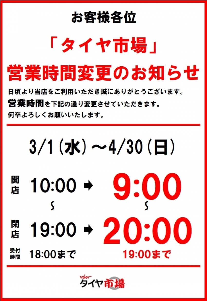 本日より営業時間が変更になります