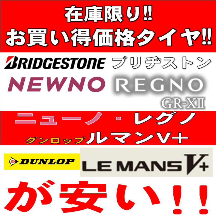 ブリヂストン ニューノ・レグノ、ダンロップ ルマンV+を販売中です。