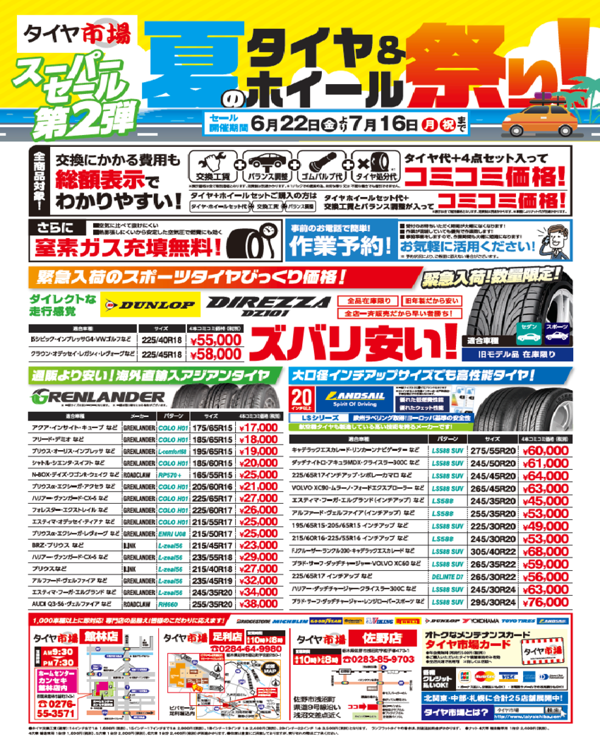 タイヤ市場 タイヤ市場佐野店 タイヤ交換 栃木県佐野市 栃木県栃木市 大平町 葛生町 藤岡町 田沼町 小山市 佐野ラーメン さのまる セール中 アライメント アライメント調整 軽自動車 普通車 SUV 4WD ドレスア 外車 輸入車 旧車 無料点検 スーパーセール タイヤ サマータイヤ アジアンタイヤ 欧州タイヤ 新車 スポーツカー