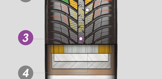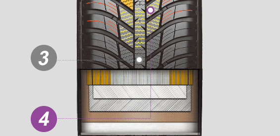 トレッドセンター部の3Dウィンターサイプとショルダー部のサマーサイプのコンビネーションは雪道や雨の日のコーナリング時に高いグリップを発揮。