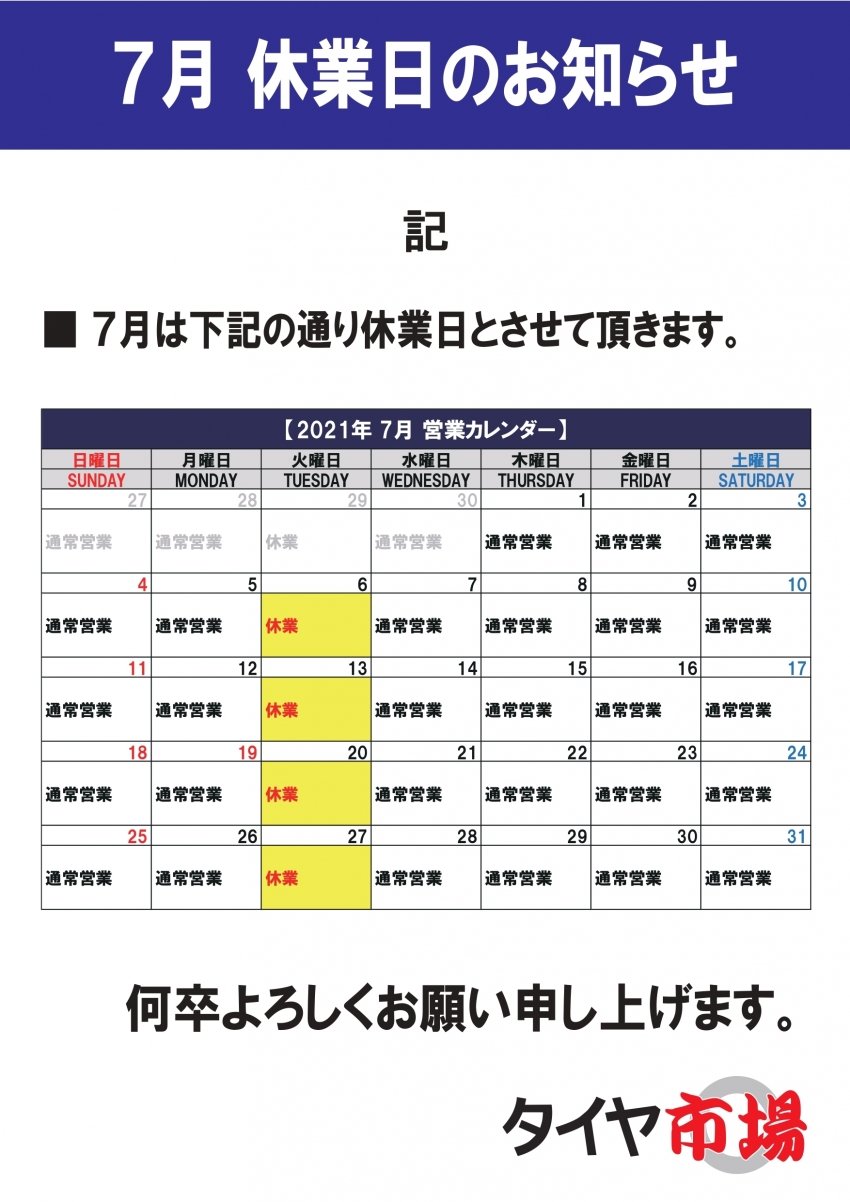 7月の営業日カレンダー【毎週火曜日が休業日になります。】