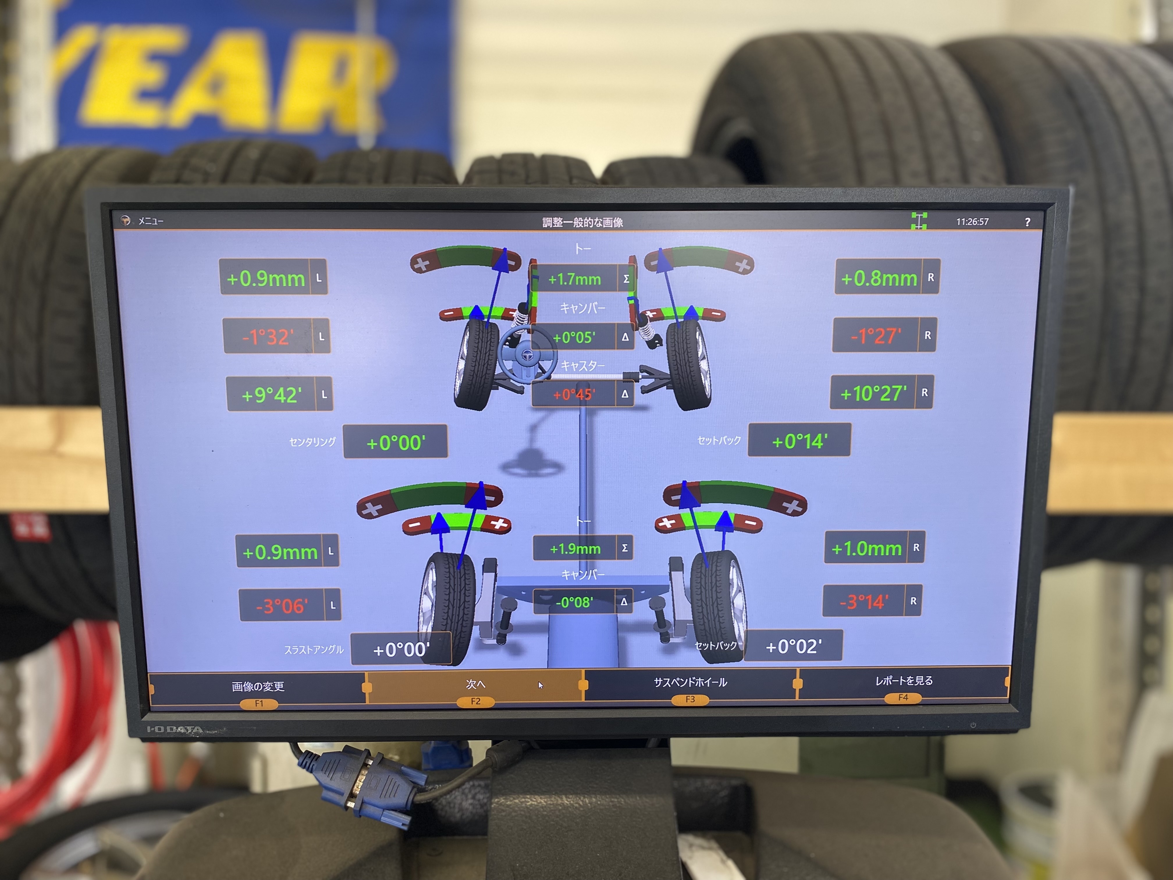 フロントは純正で、トー、キャンバー、キャスターが調整出来、