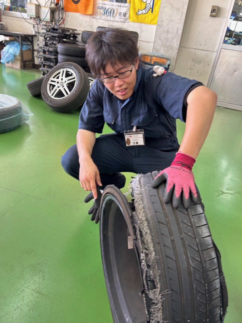 タイヤの中の針金が露呈してしまっていて