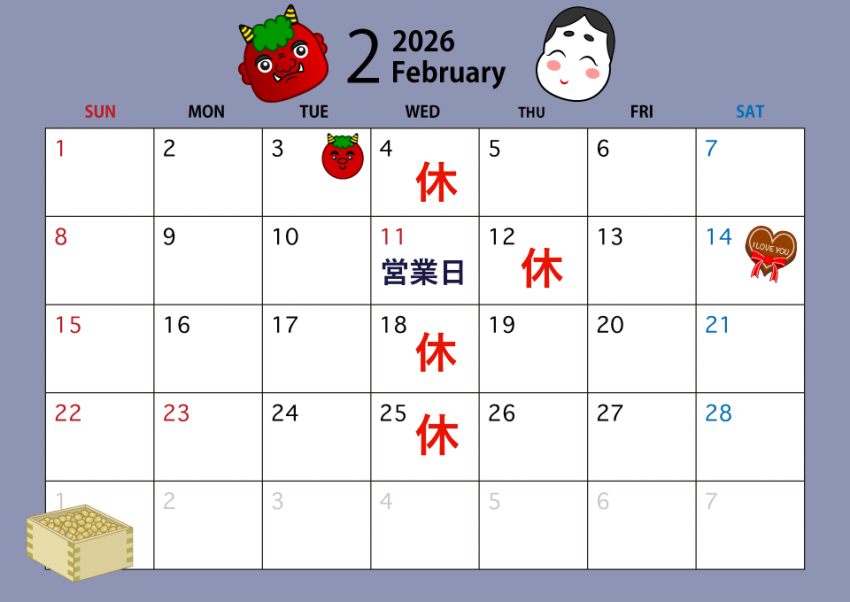 店休日は2/4、2/12、2/18、2/25がお休みとなっております。
