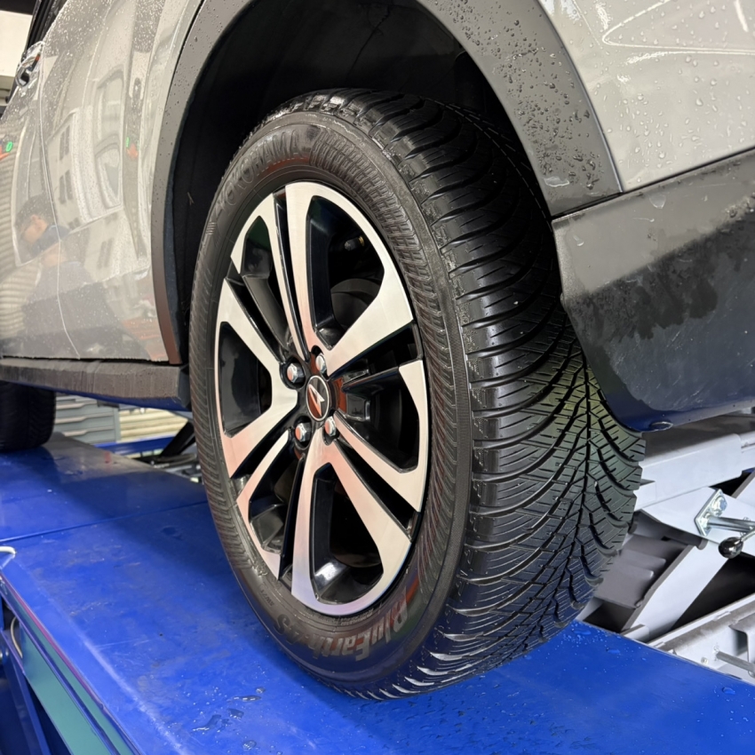 そしてタイヤをよく見ると、、、オールシーズンタイヤを装着されていました。左2本がまさかの回転方向とは逆に組まれてしまっていて、3年間も性能が発揮されていない状態でした。