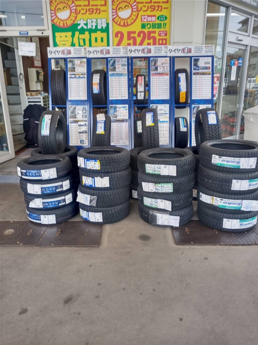 画像に写っている、プレミアムサマータイヤのBRIDGESTONE レグノや、格安だけど本格性能サマータイヤのLANDSAIL LS388、グッドイヤーのオールシーズン、その他多数の商品を取り揃えてお客様のタイヤ交換に備えてお待ちしております。