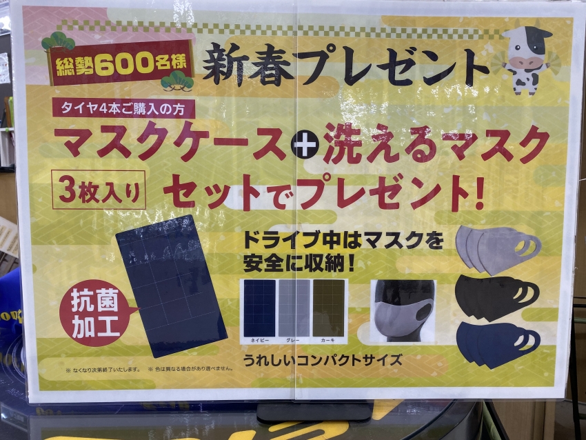 タイヤ4本購入して頂いた方に洗えるマスクプレゼント中です!