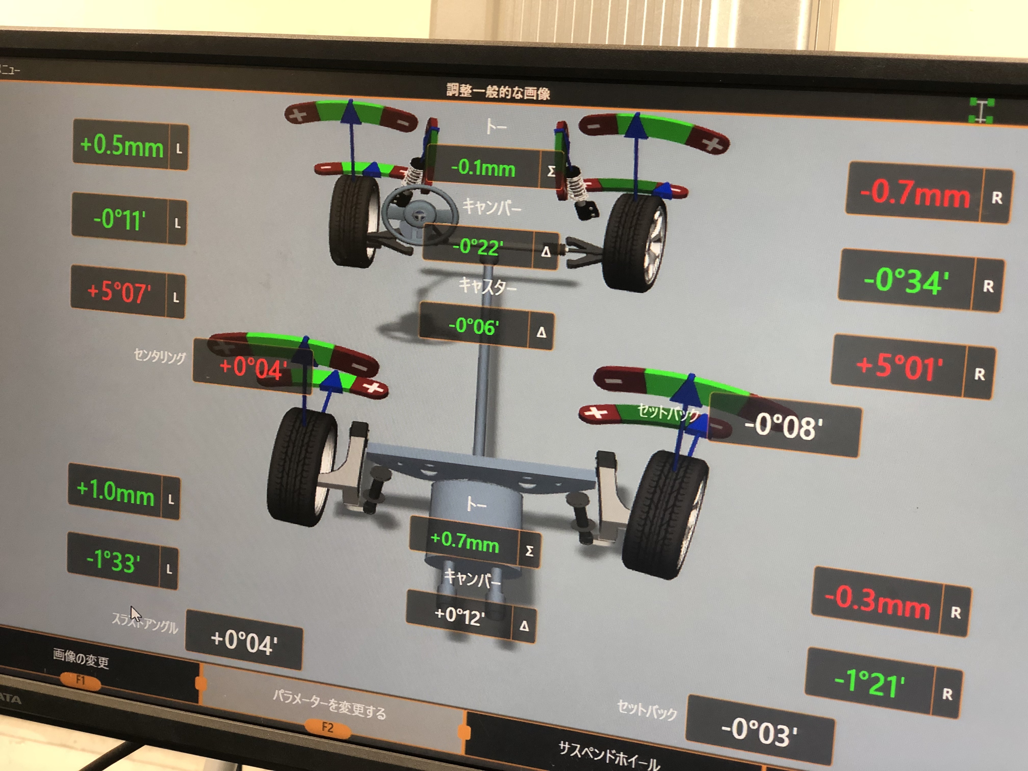 フロントトー、リアトーを基準値で調整させていただきました(*´ω`*)
