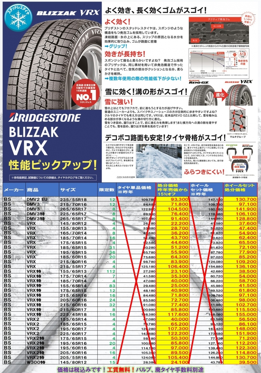 ブリジストンのスタッドレスがアウトレッド価格にてご提供!!