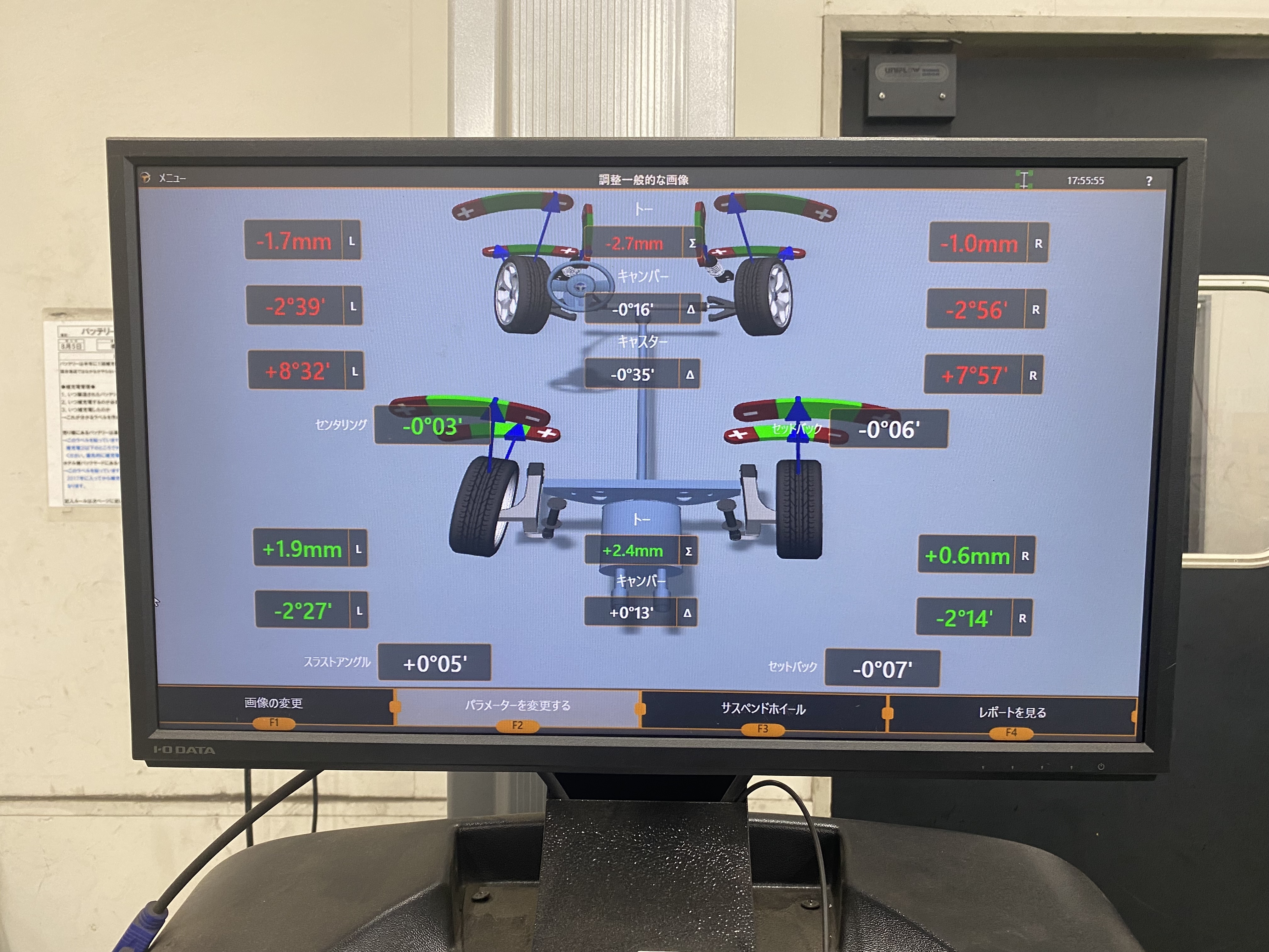 フロントがトーアウト、リアがトーインでズレが出ておりました。