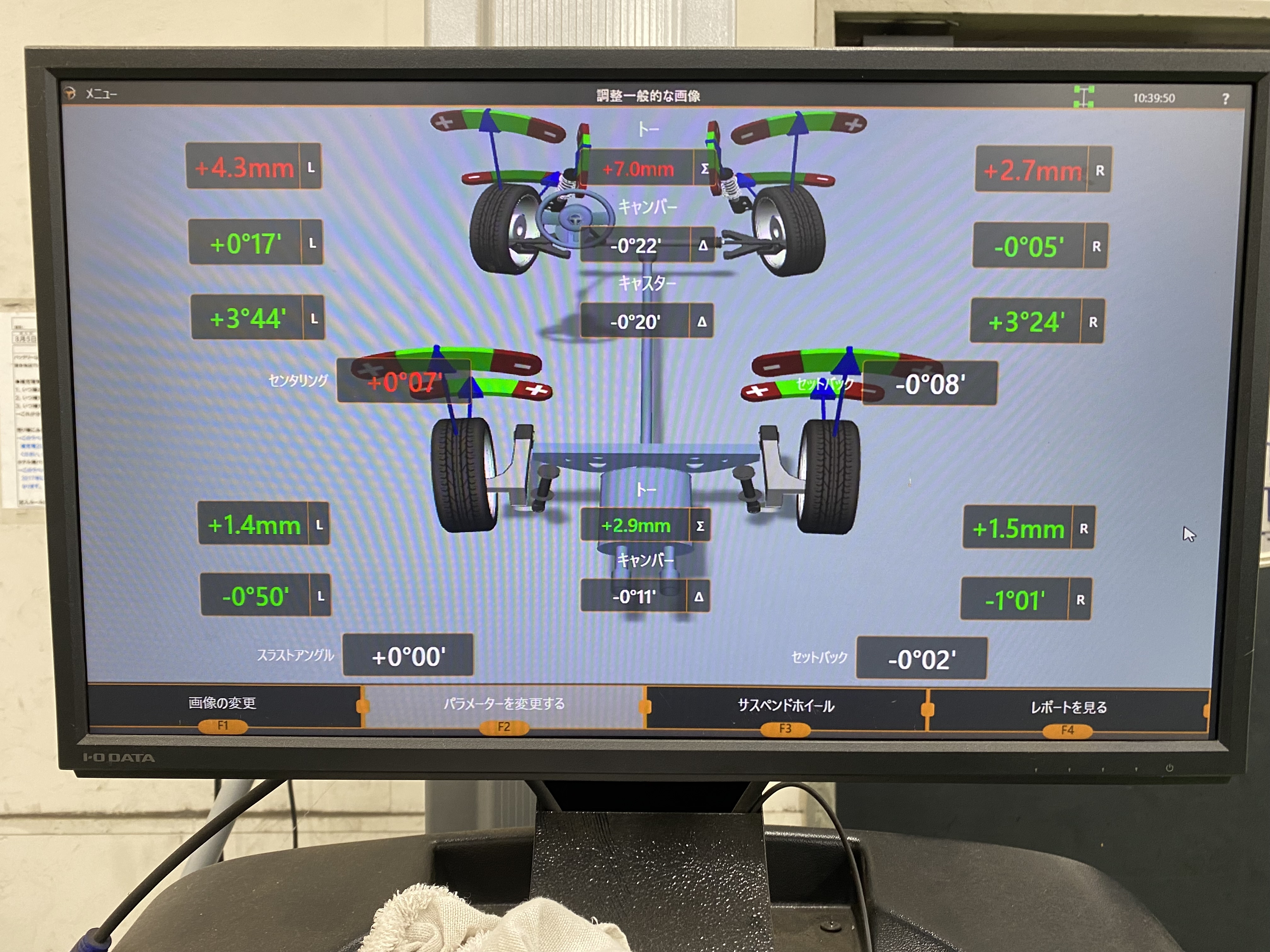 ソリオはフロントのトー角の調整ですが測定すると、左右トーインで基準値からズレていました。。。