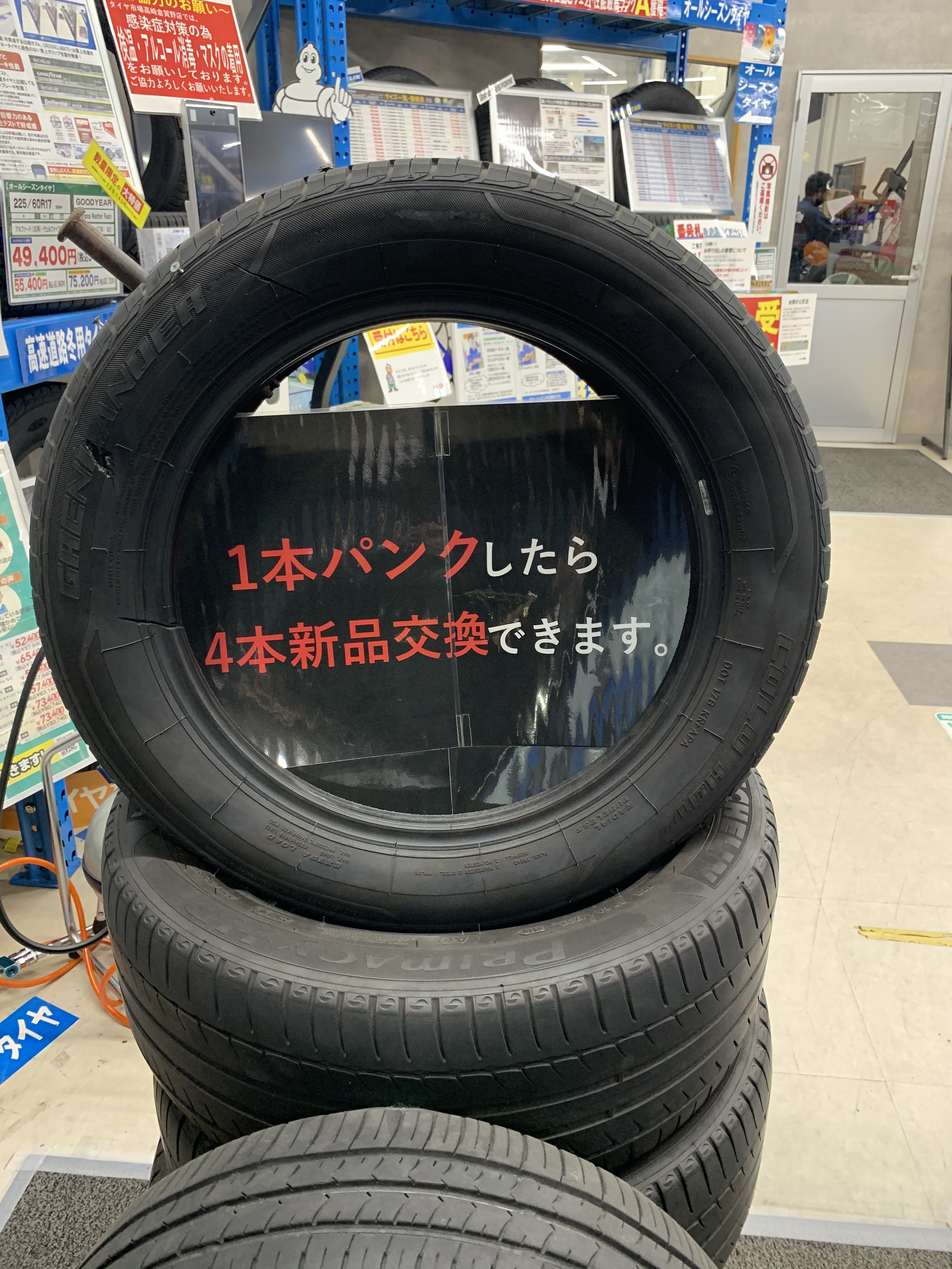 1本のパンクで4本新品のタイヤと交換出来ます!!