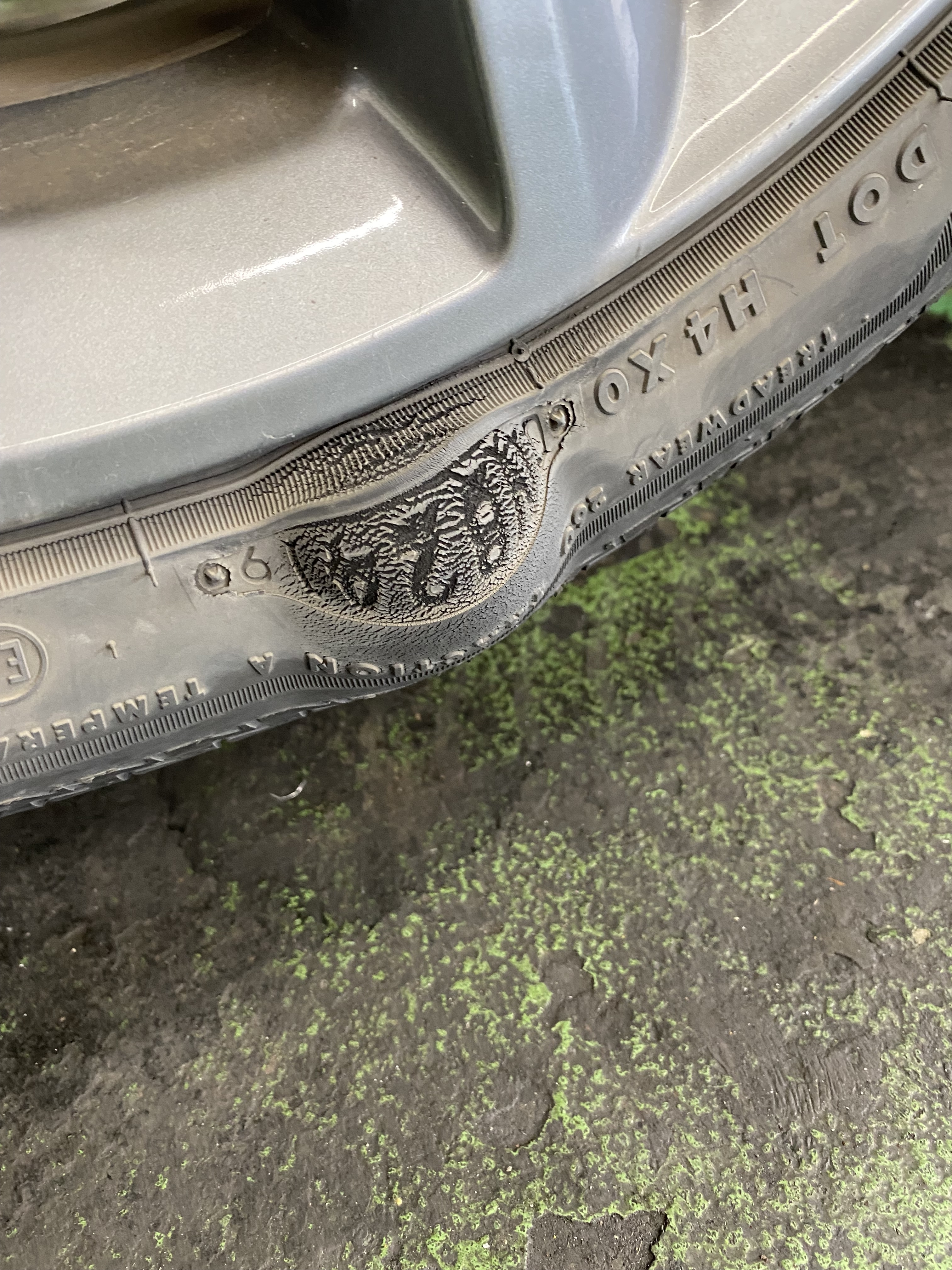 この状態をピンチカットと言い、縁石に強く乗り上げた際の衝撃などが原因でタイヤ内部のカーカスコードが切れてしまっている状態です。