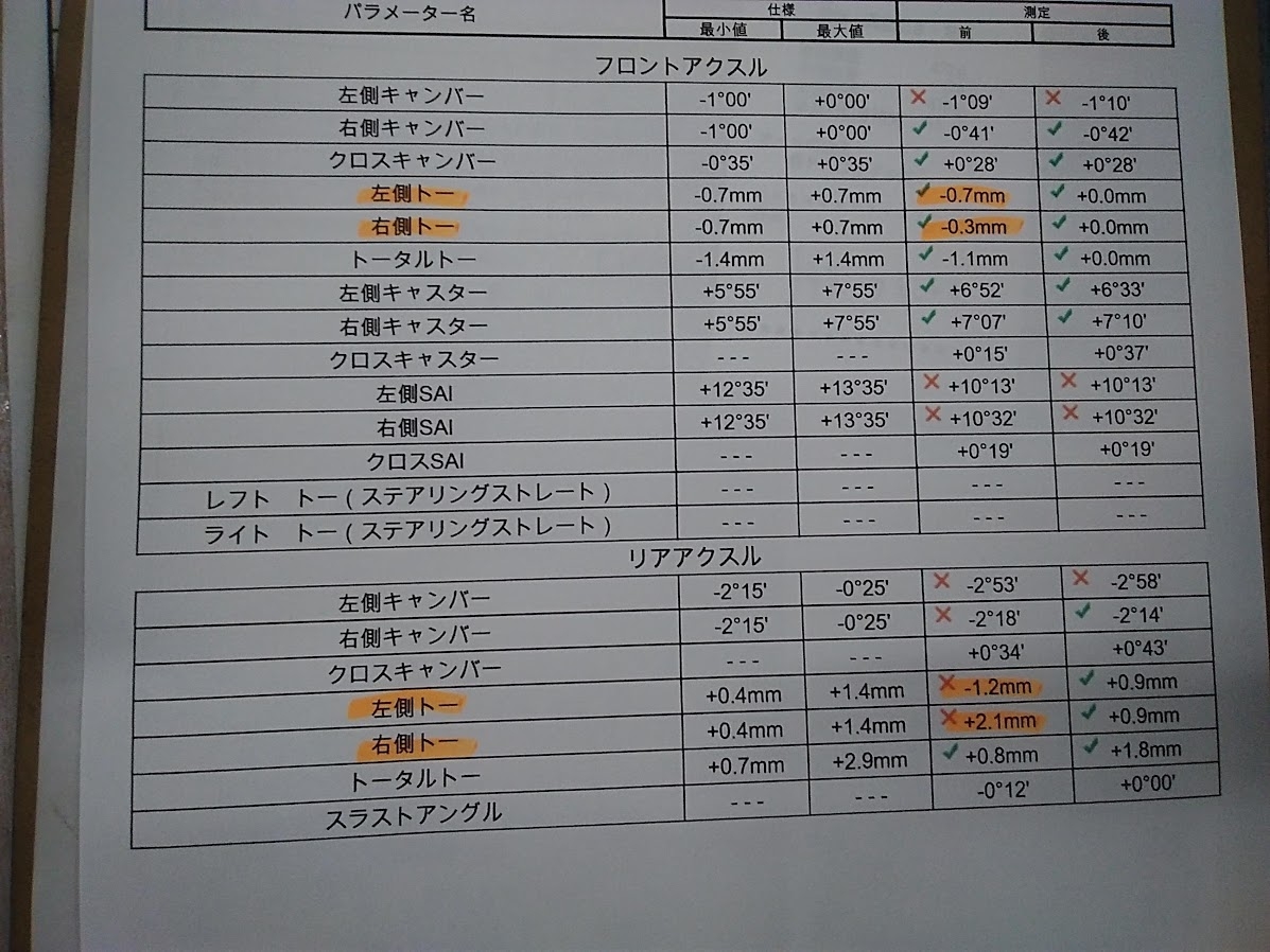 こちらの数値を基準となる値まで変更してあげる事でタイヤの片ベリ(偏摩耗)