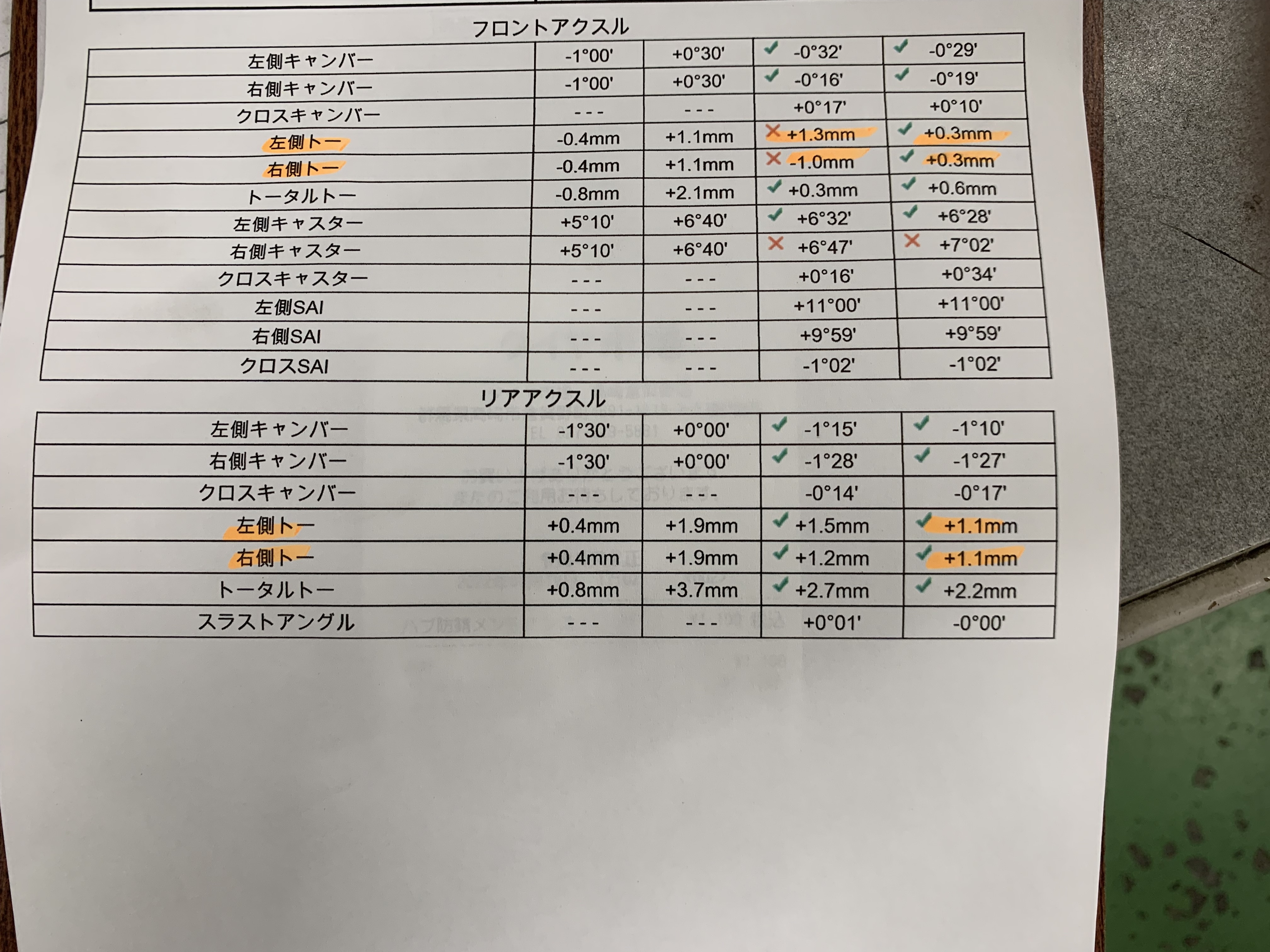 今回はタイヤの偏摩耗抑制、ハンドルセンター出しの為
