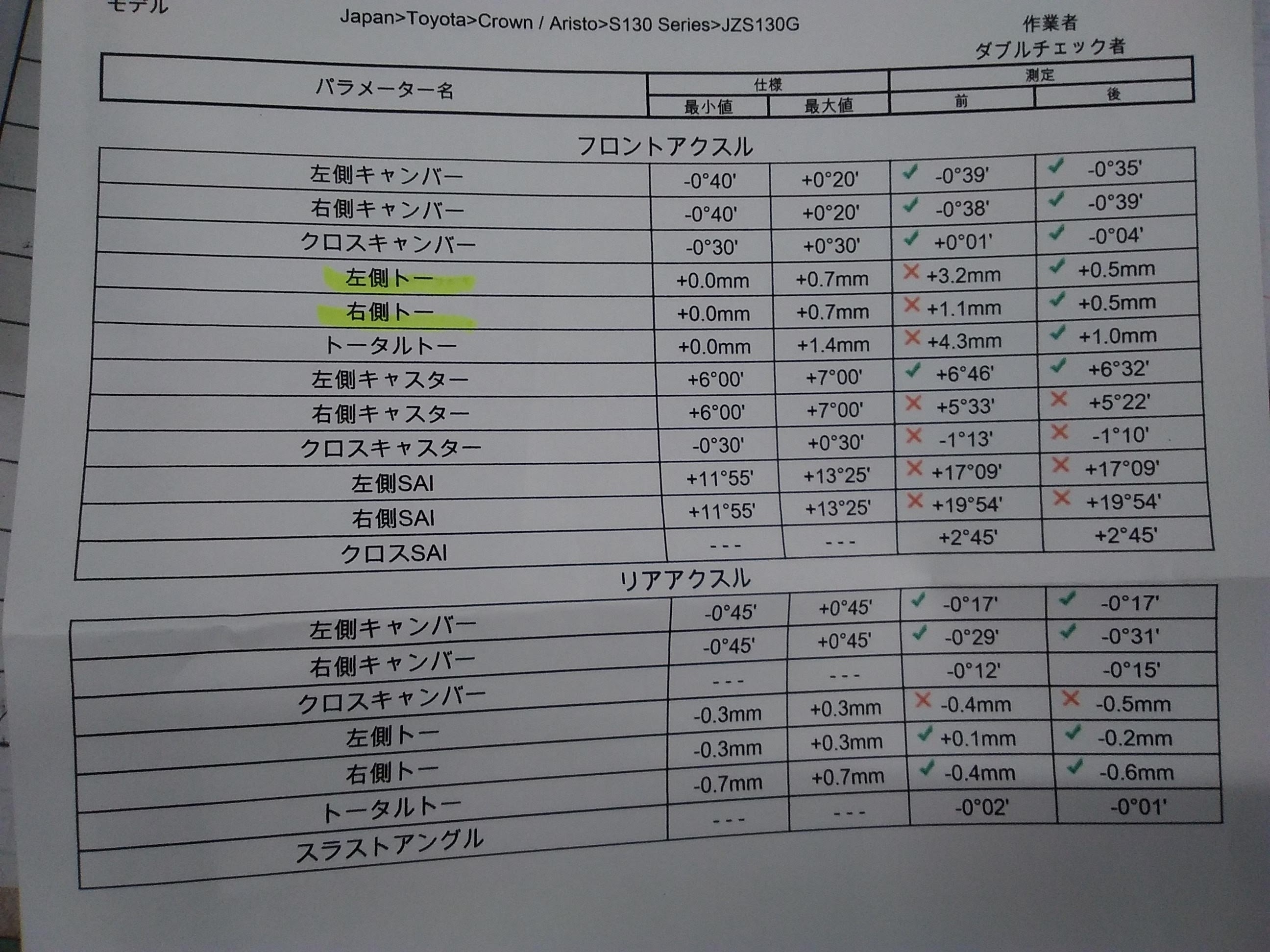 偏摩耗の原因になるので左右共に基準値に調整しました!