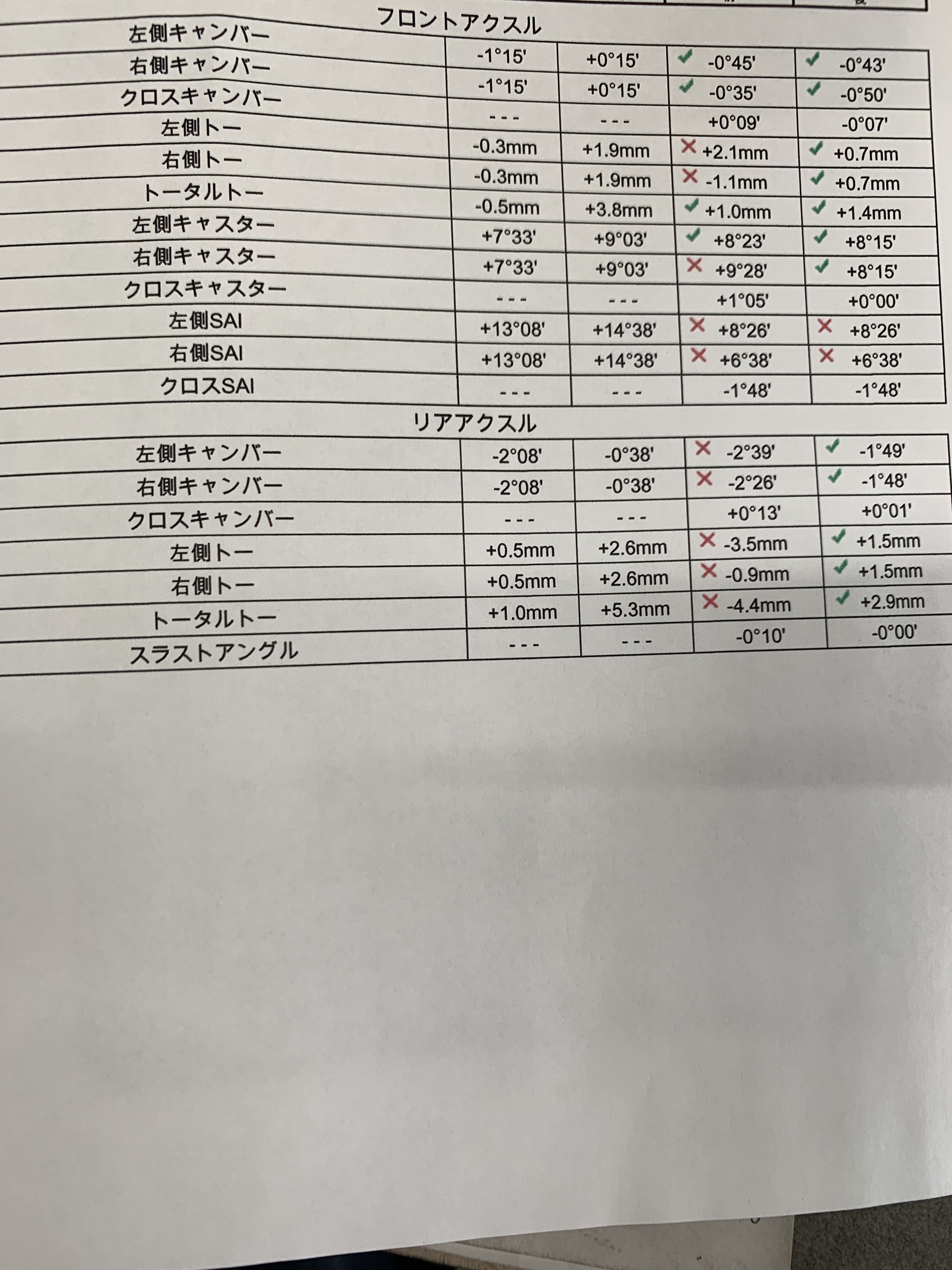 調整箇所はフロントのキャンバー、キャスター、トー