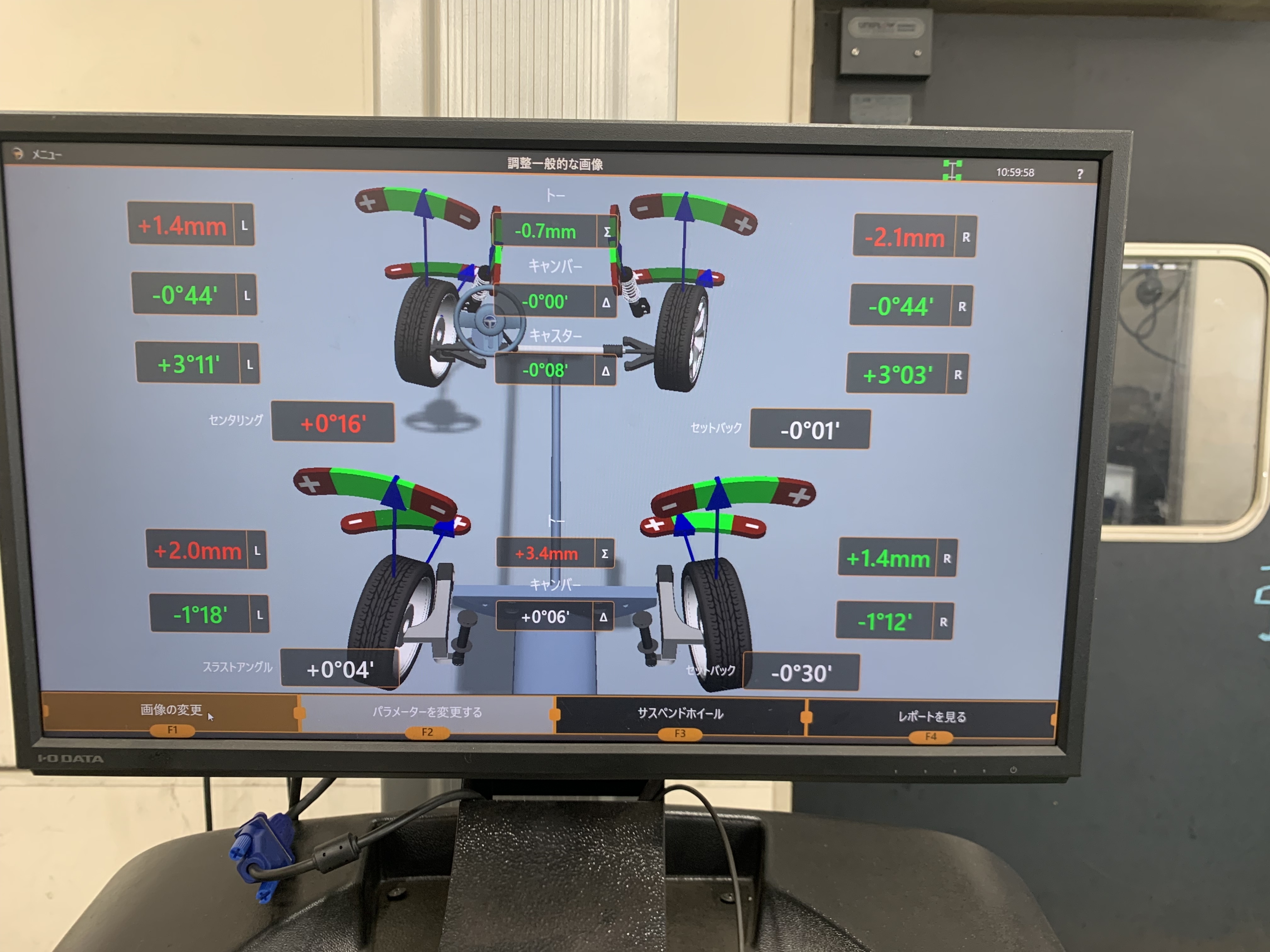 測定をした結果フロント左右、左後ろにズレが出てしまっていました!