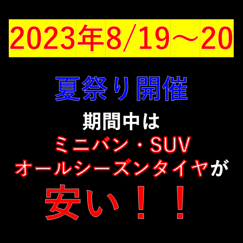 今週末8/19~20はミニバン・SUV・オールシーズンタイヤがお安くなっております!
