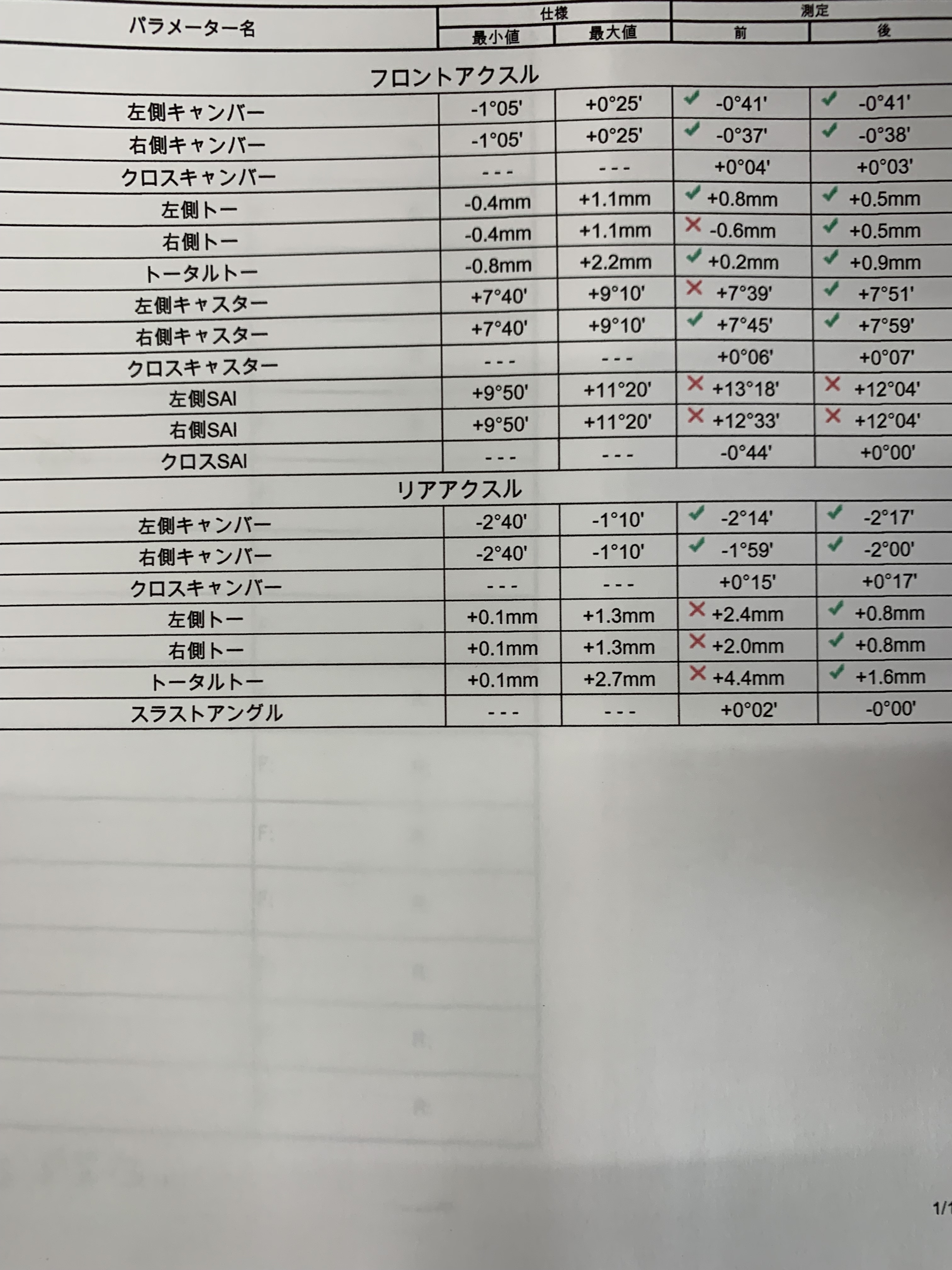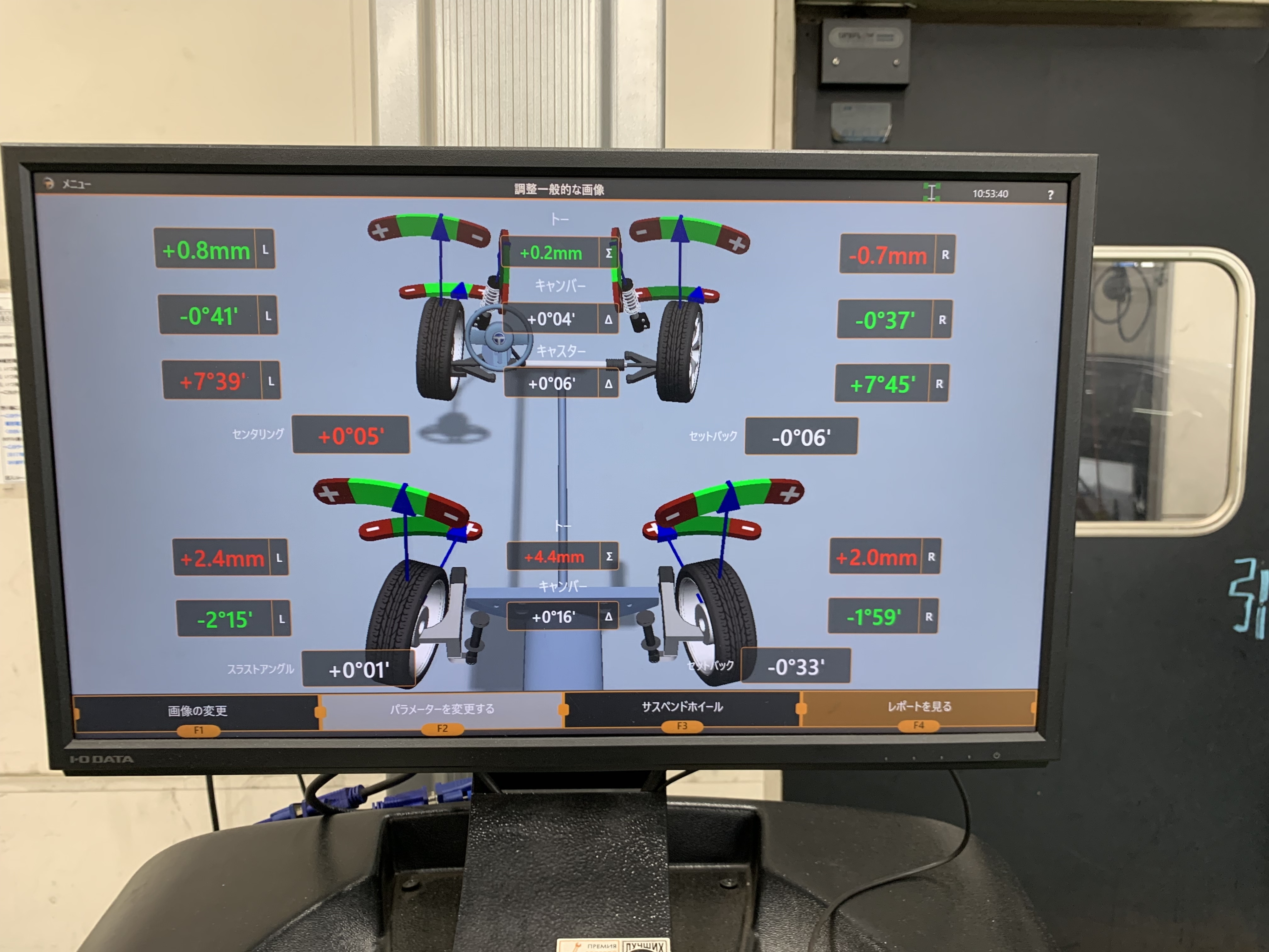 測定をした結果、左前と後ろ左右のトーがズレてしまっていました!