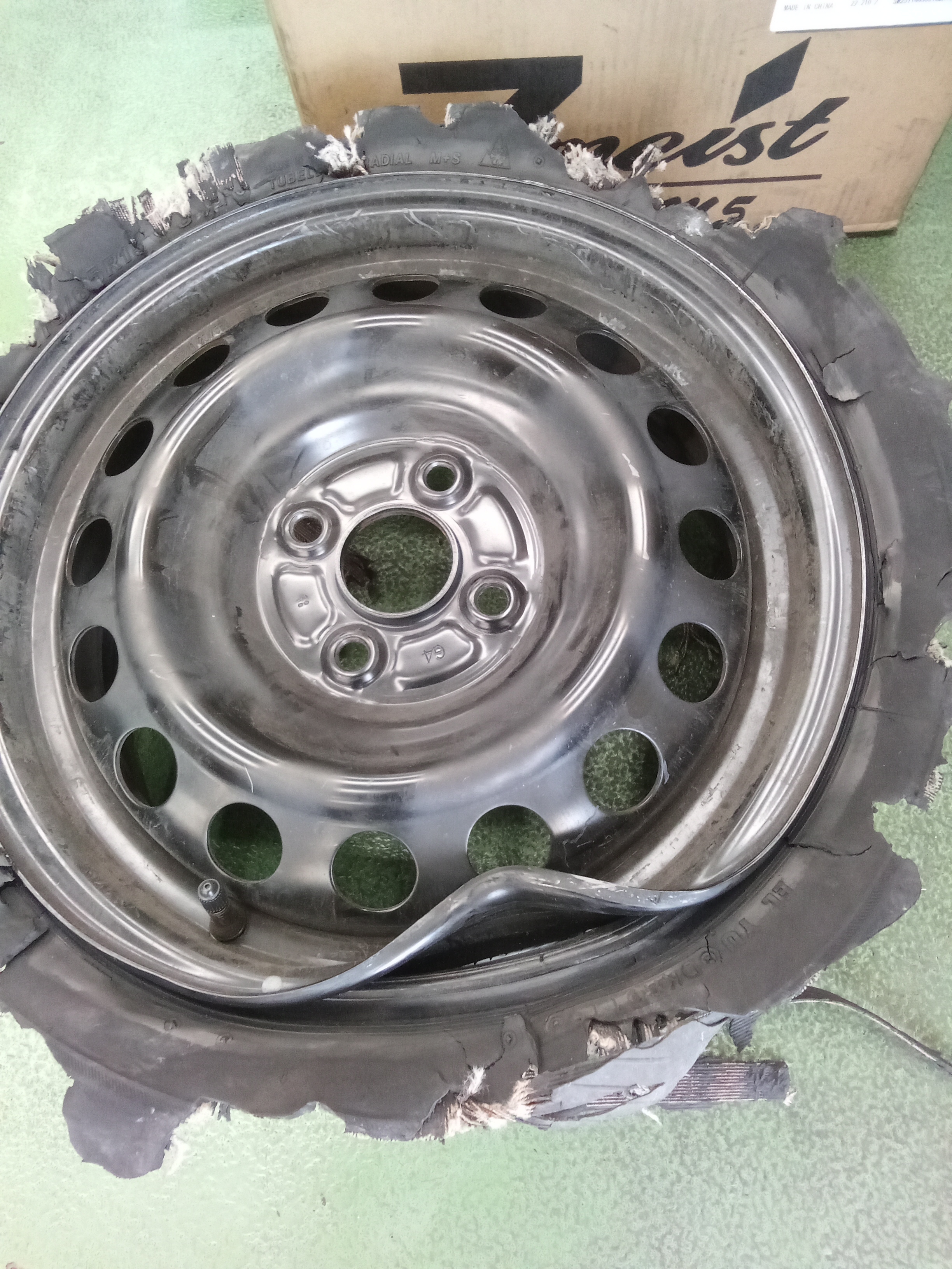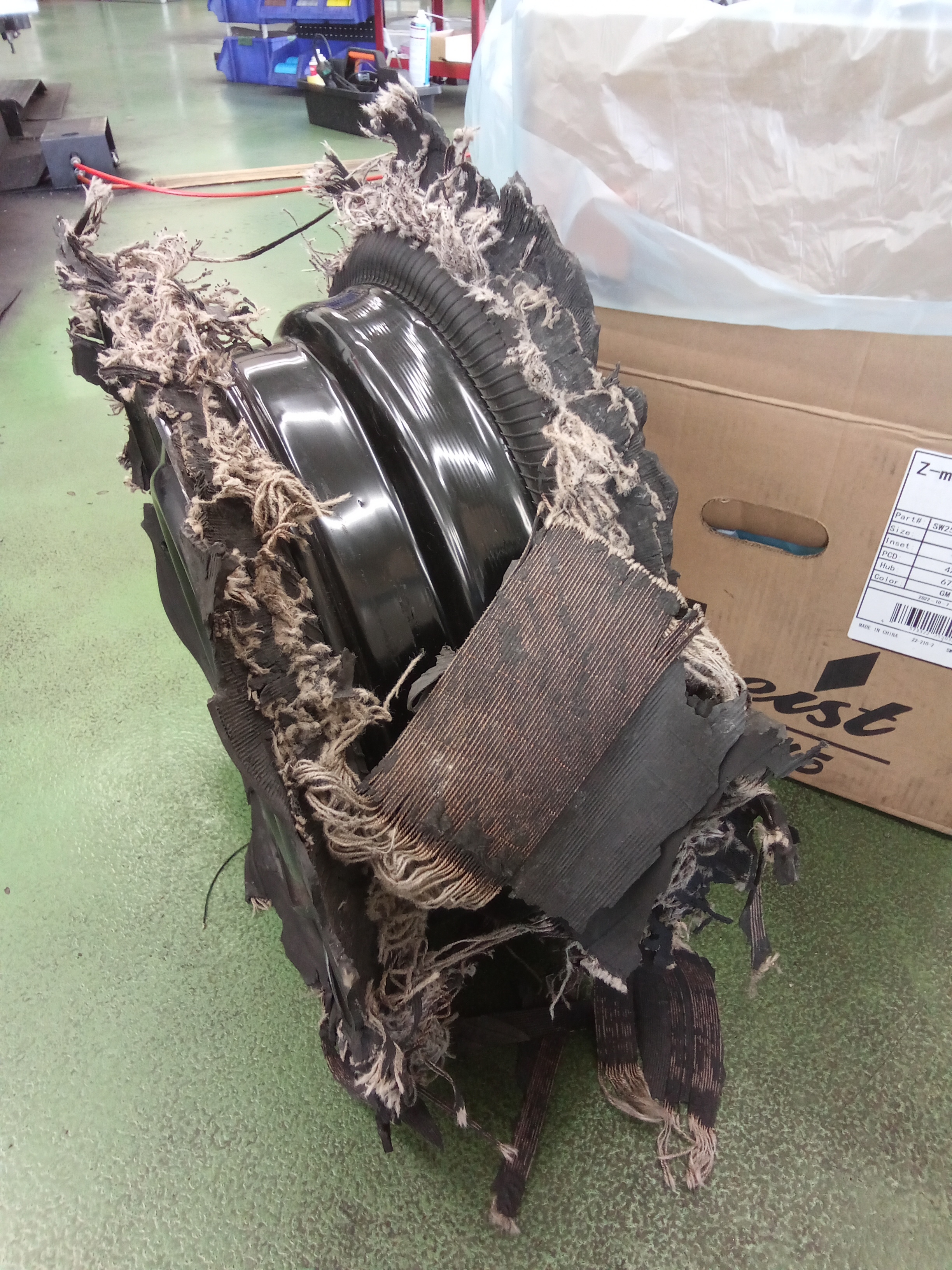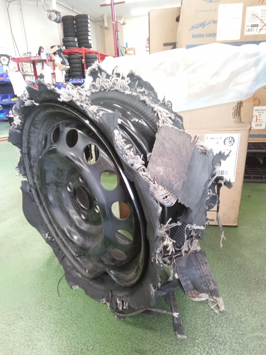 タイヤの中のワイヤーが出てしまって、普段見えないゴムの内側が見えています