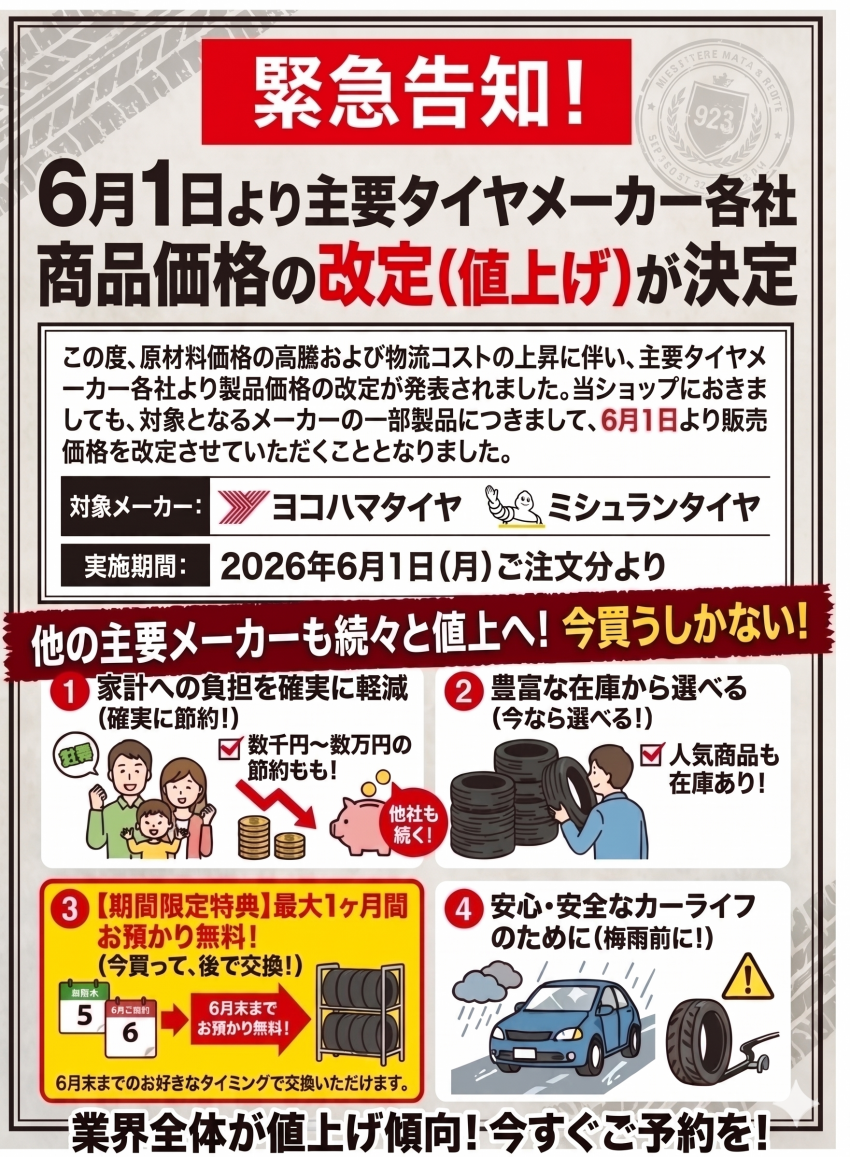 緊急告知! 6月1日 より タイヤメーカー各社 値上げします!
