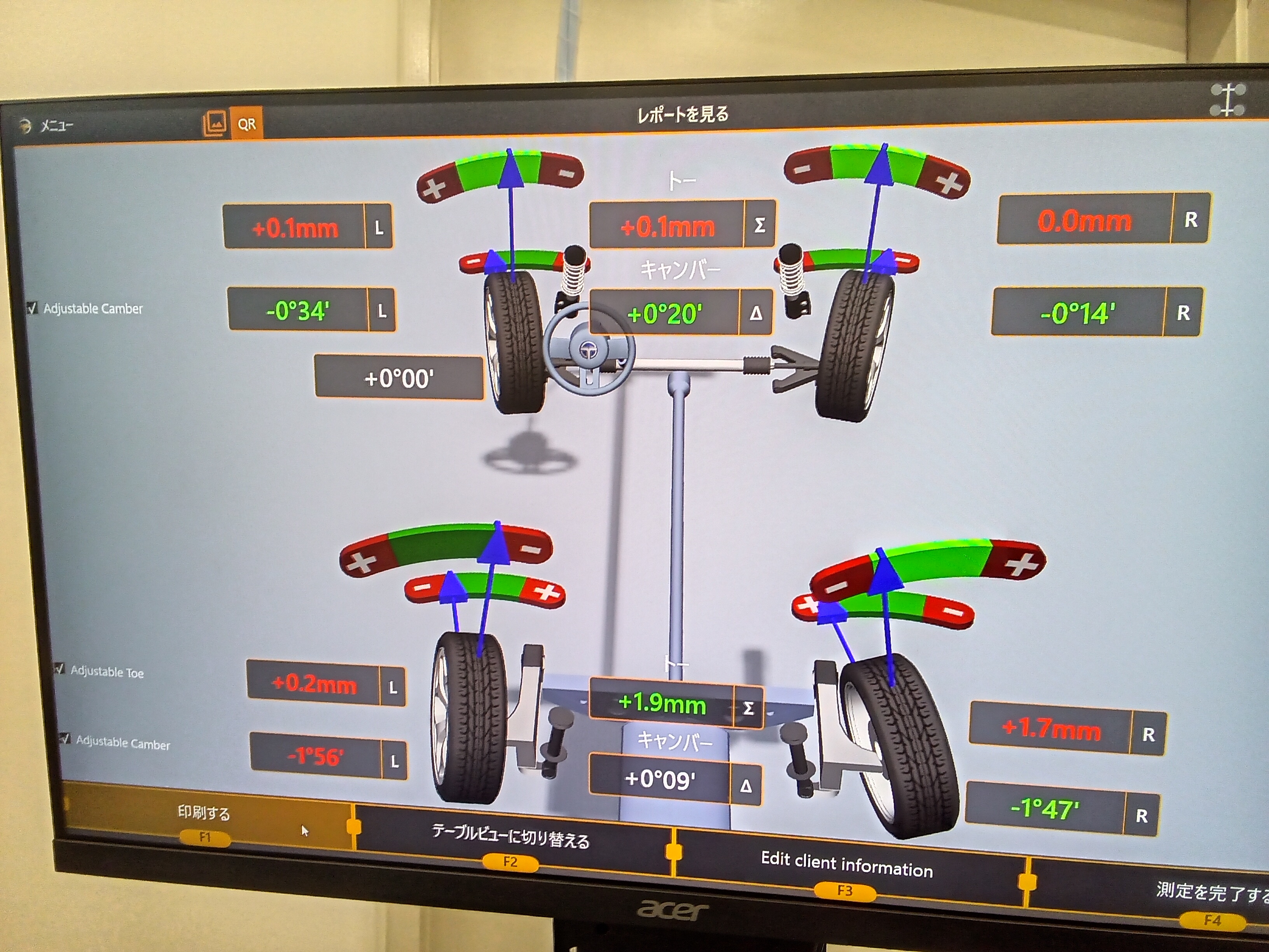 全て基準値からはズレてしまっているのですが特に右リアのタイヤが内股になってしまっていますよね