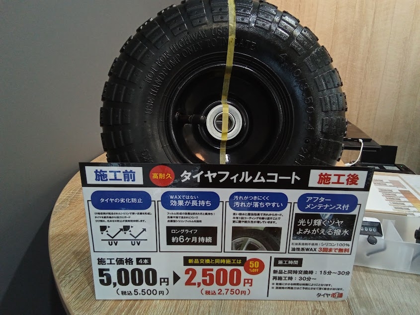 フィルムコートのみの施工だと税込5,500円でのご案内になりますがタイヤ交換との同時施工だと、税込2,750円とお安くご案内できます!