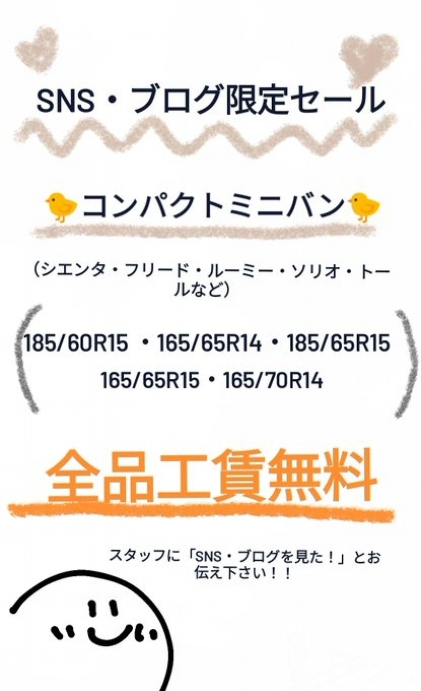 コンパクトミニバン「シエンタ・フリード・ルーミー・ソリオなど」にお乗りの方必見です!!6月2日まで工賃無料です!!高崎周辺にお住みの方タイヤ市場高崎緑町店へ!!!