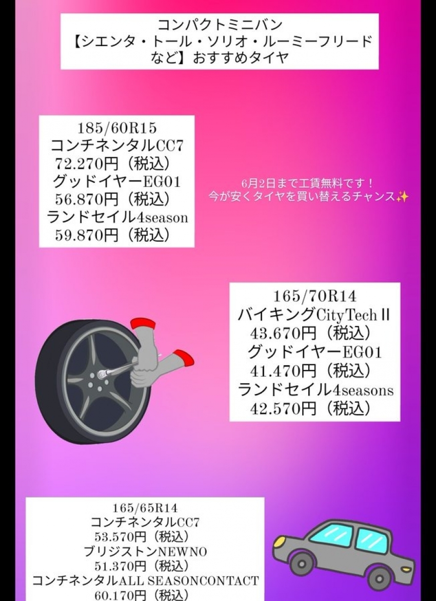 高崎周辺でコンパクトミニバンにお乗りの方必見です!!6月2日までの限定です!対象商品の工賃が無料⁉タイヤ交換をするならタイヤ市場へ!!