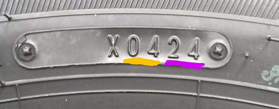 タイヤの製造年はサイドウォール部に書いてあり、↑の画像のタイヤだと24年の四週目、つまり2024年の一月頭に作られたタイヤだということがわかります!