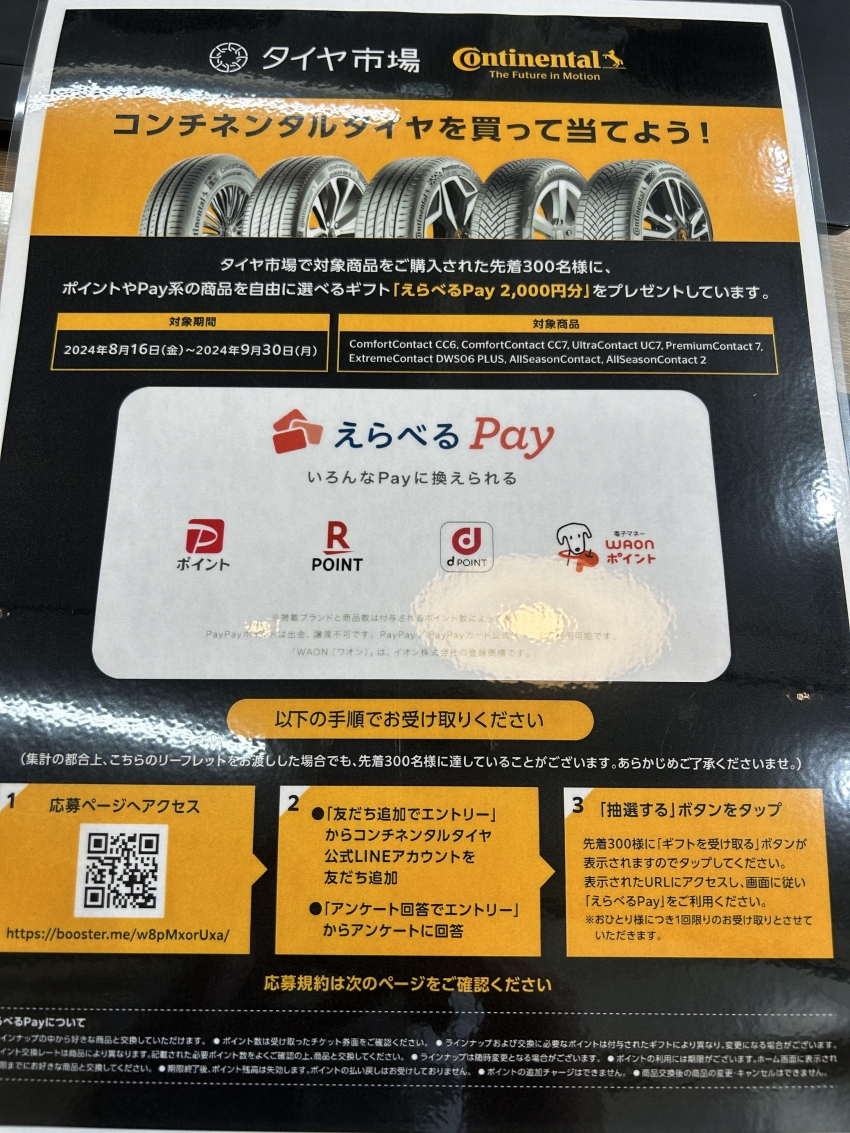 コンチネンタルタイヤを買って『えらべるpay 2,000円分』をゲットしましょう!高崎市周辺にお住みの方はタイヤ市場高崎緑町店へ!