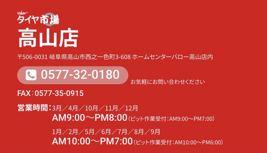 AM9:00~PM8:00(ピット作業受付:AM9:00~PM7:00)1月/2月/5月/6月/7月/8月/9月