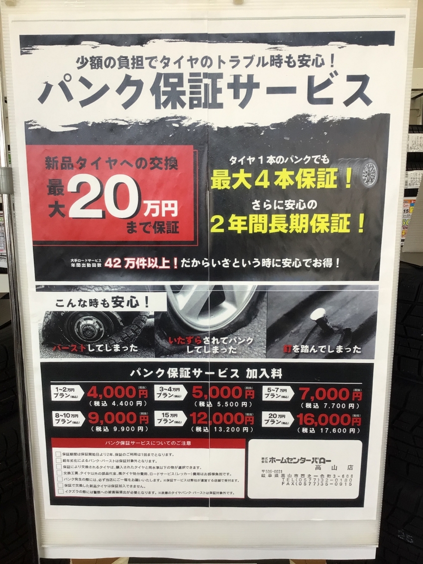 そんな時にパンク保証に入っていればタイヤ代はタダになります!!しかも同等性能のタイヤ4本!!!(工賃・廃タイヤは負担になります)