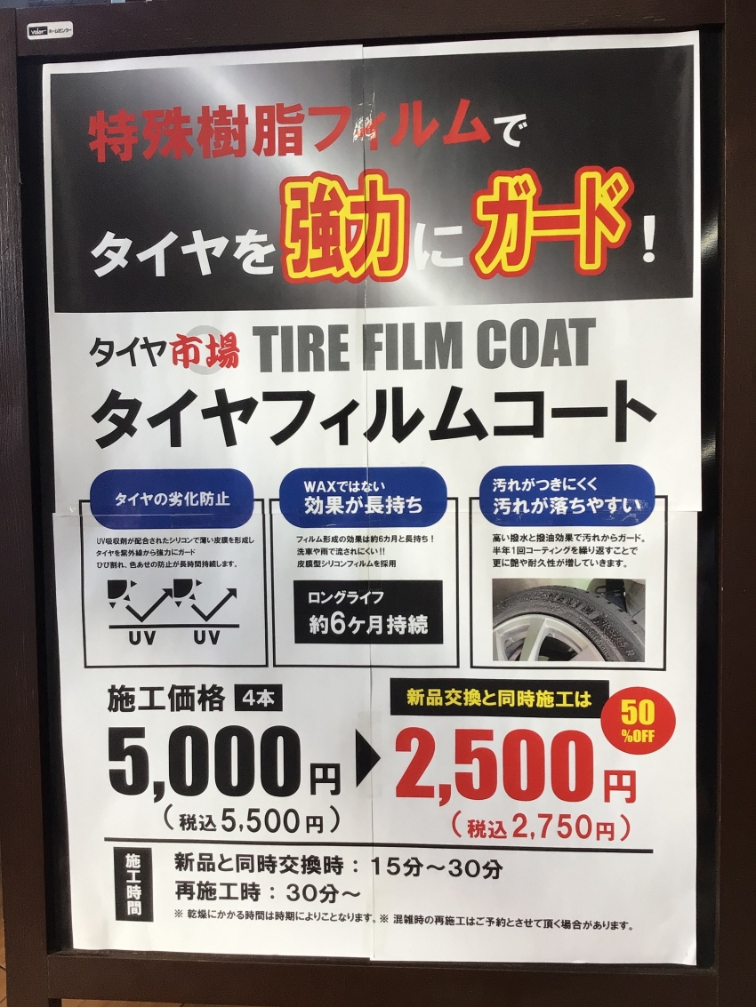 購入したタイヤを長く綺麗にお使いいただくためにもタイヤフィルムコートいかがでしょうか?