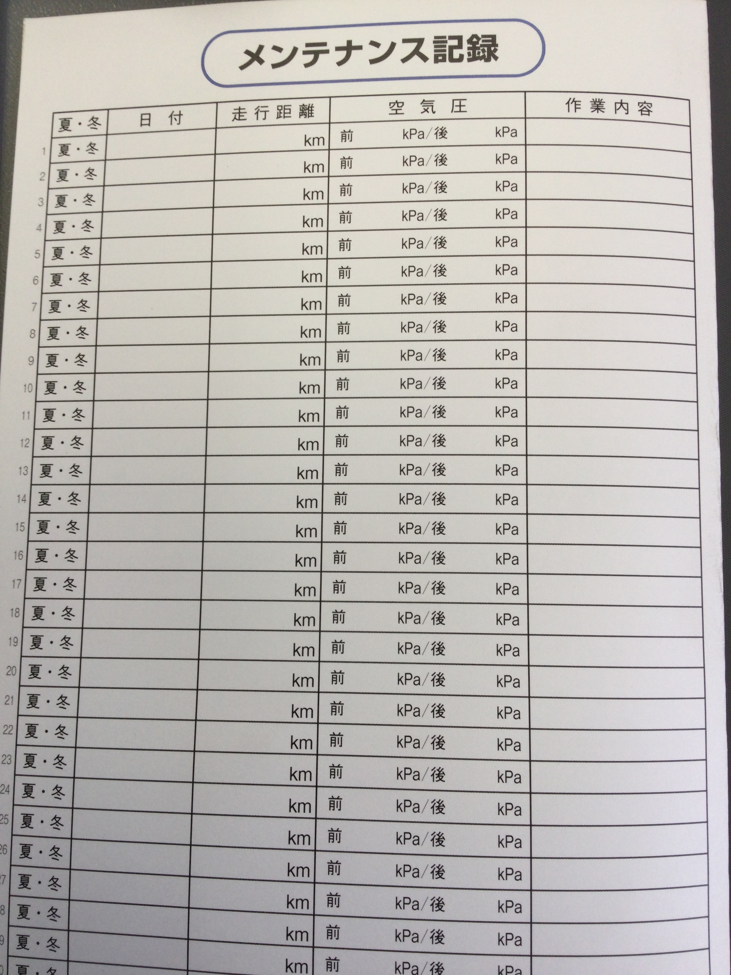 このようにメンテナンスの記録も記入していきますのでいつどのような作業をしたか、その時の空気圧や走行距離などお客様もわかるようにしていますので、是非有効活用してみてはいかがでしょうか!!