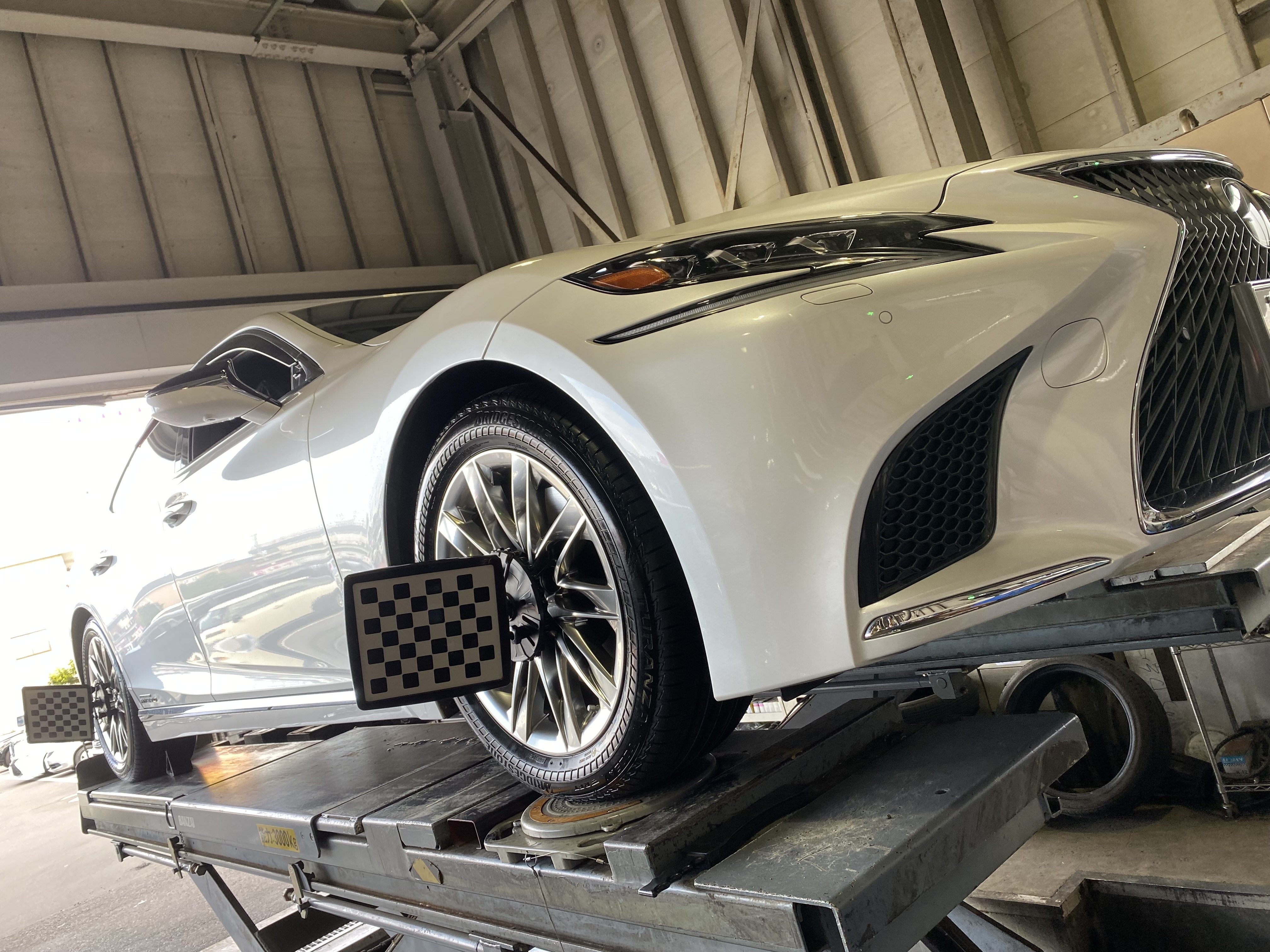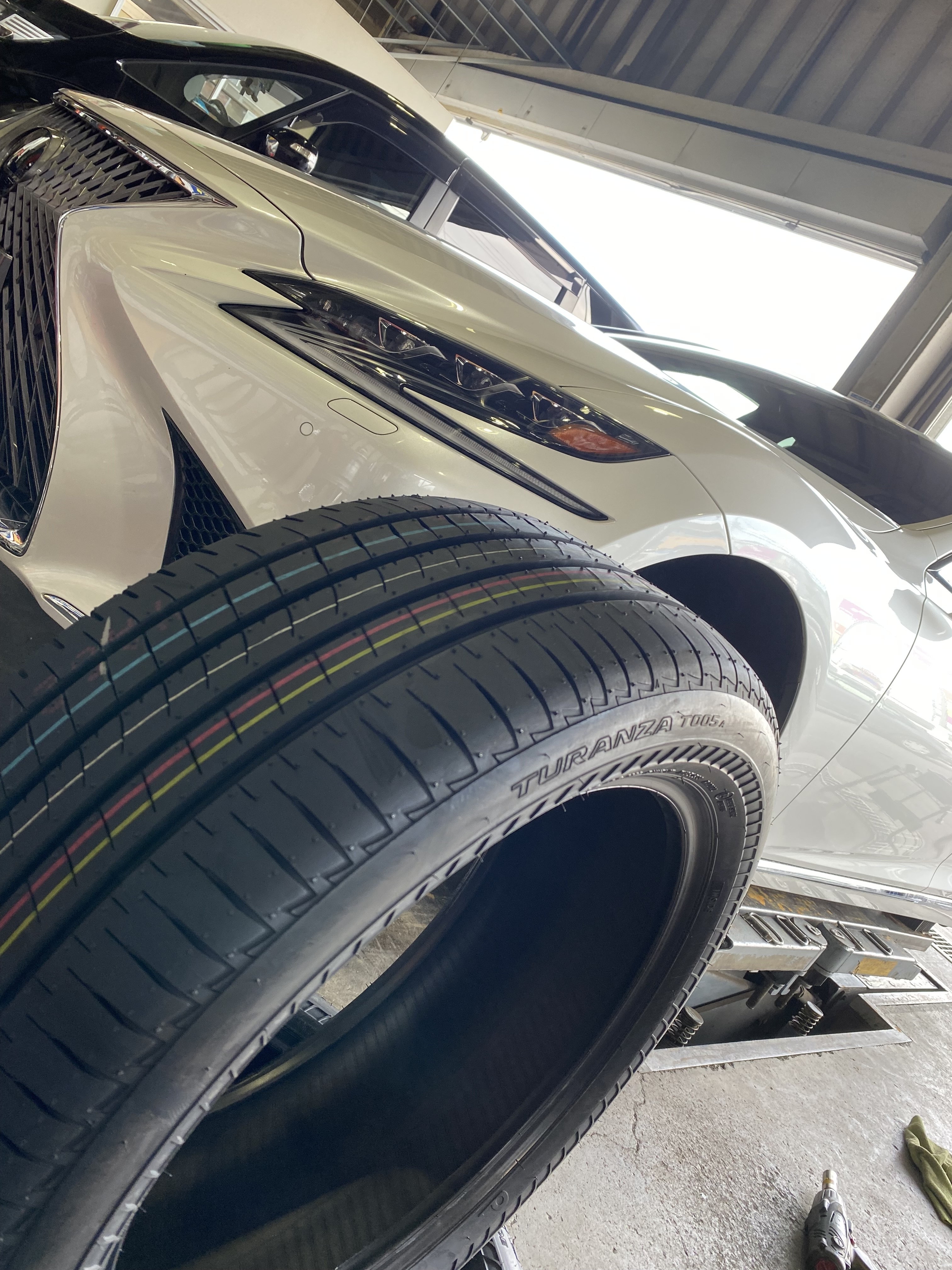 レクサスLS500hのタイヤ4本交換&アライメント調整!ランフラットタイヤの組み替えもお任せください♪