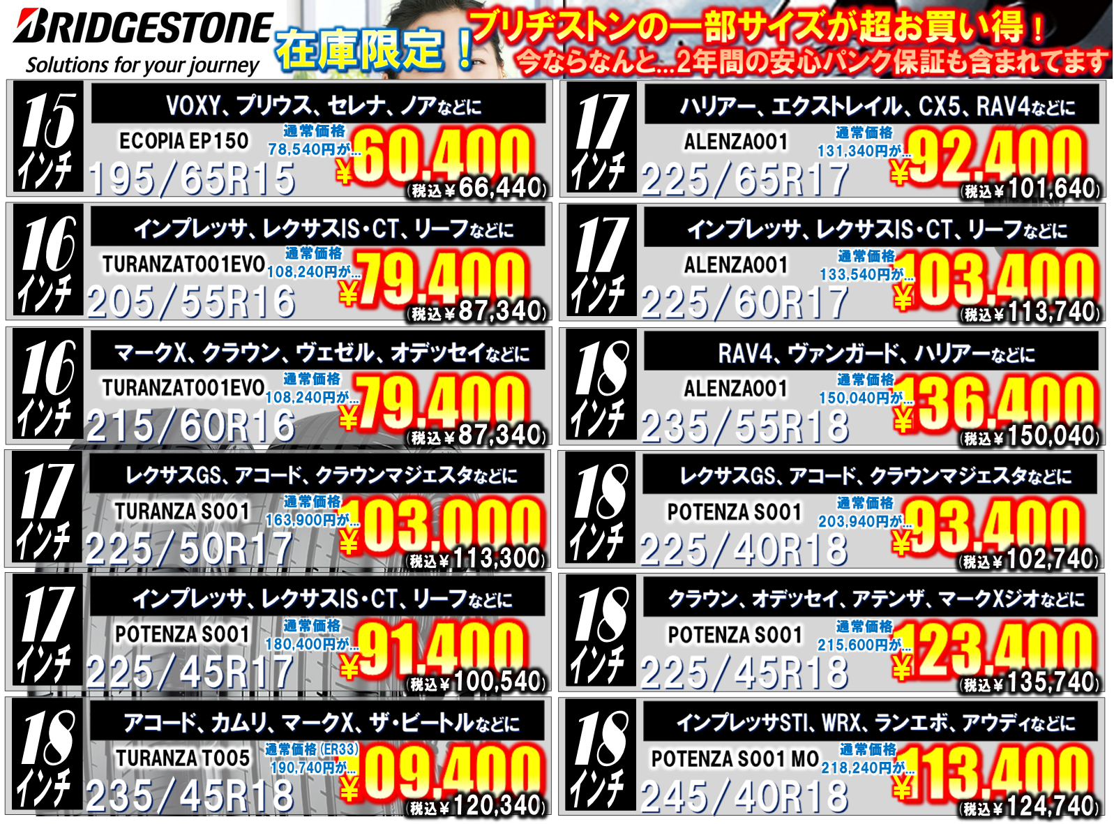 ブリヂストンの上級タイヤが大特価!セダン・ミニバンからSUVまでラインナップ!圧倒的価格!