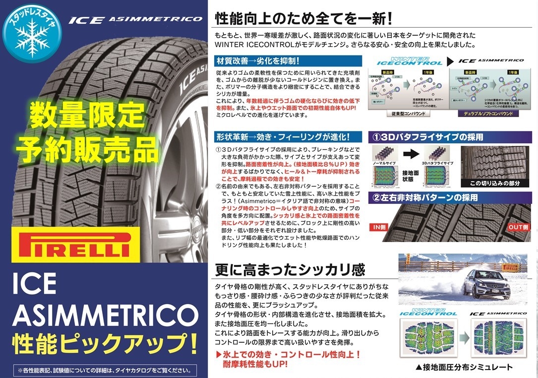 スタッドレス大量入荷!ピレリ(アイスアシンメトリコ)数量限定・予約販売品 多数のサイズ大量入荷したので自分のサイズがあるか、いくらするのか、是非ご確認ください!