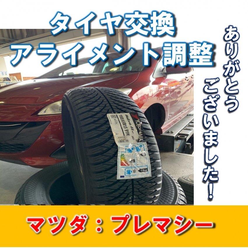 今回はマツダ プレマシー のタイヤ交換、アライメント調整を